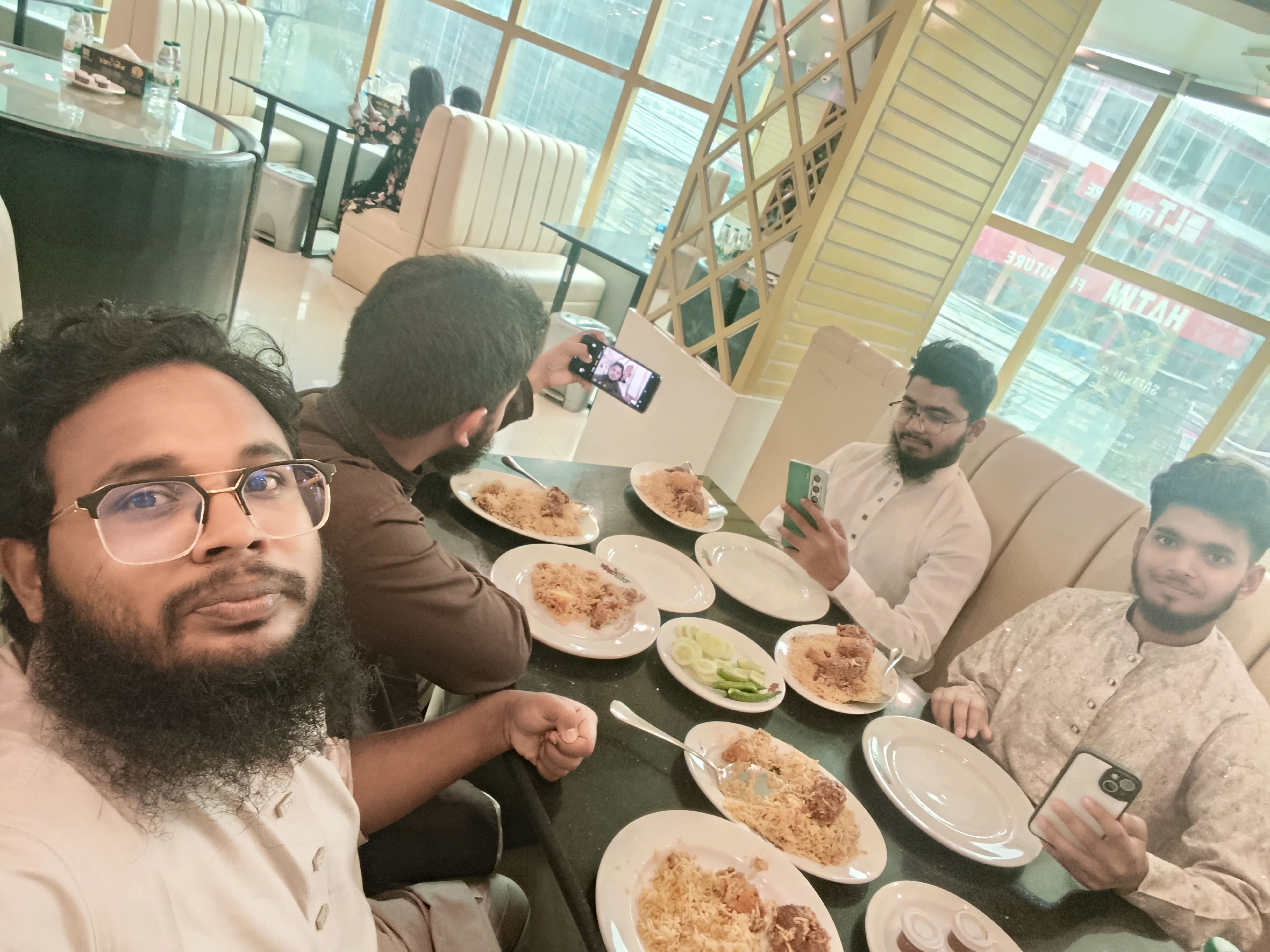 The people I went with are all my colleagues and work on this platform. So, after we went, first we sat for a while at a restaurant called Kacchi Dine, and there they took pictures and reviewed. Then we ordered Kacchi. After that, the Kacchi arrived.