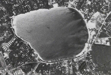 Lake Ronkonkoma is the largest fresh water lake on Long Island, NY and sits right in the middle of the island. It is 243 acres in size. It is also shaped in the form of a human skull.