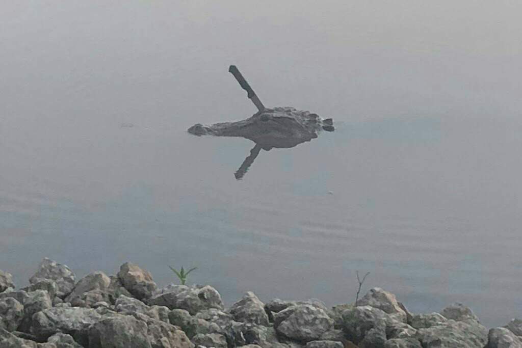 A gator, a freaking gator showing us that he is a resilient little predator. It seems to be lodged in his skull, between the eyes, but he's alive and well it seems.