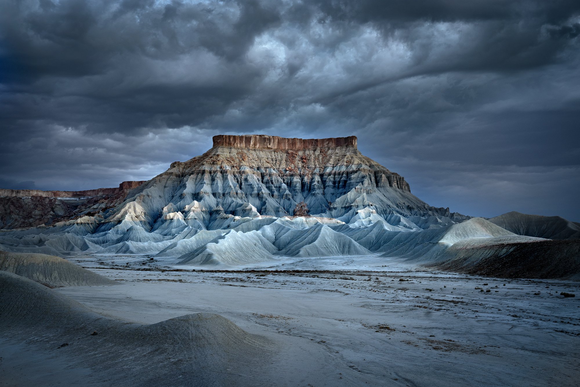 Abrewing storm passes over the interesting rock formations found Beyond the Badlands of Utah.