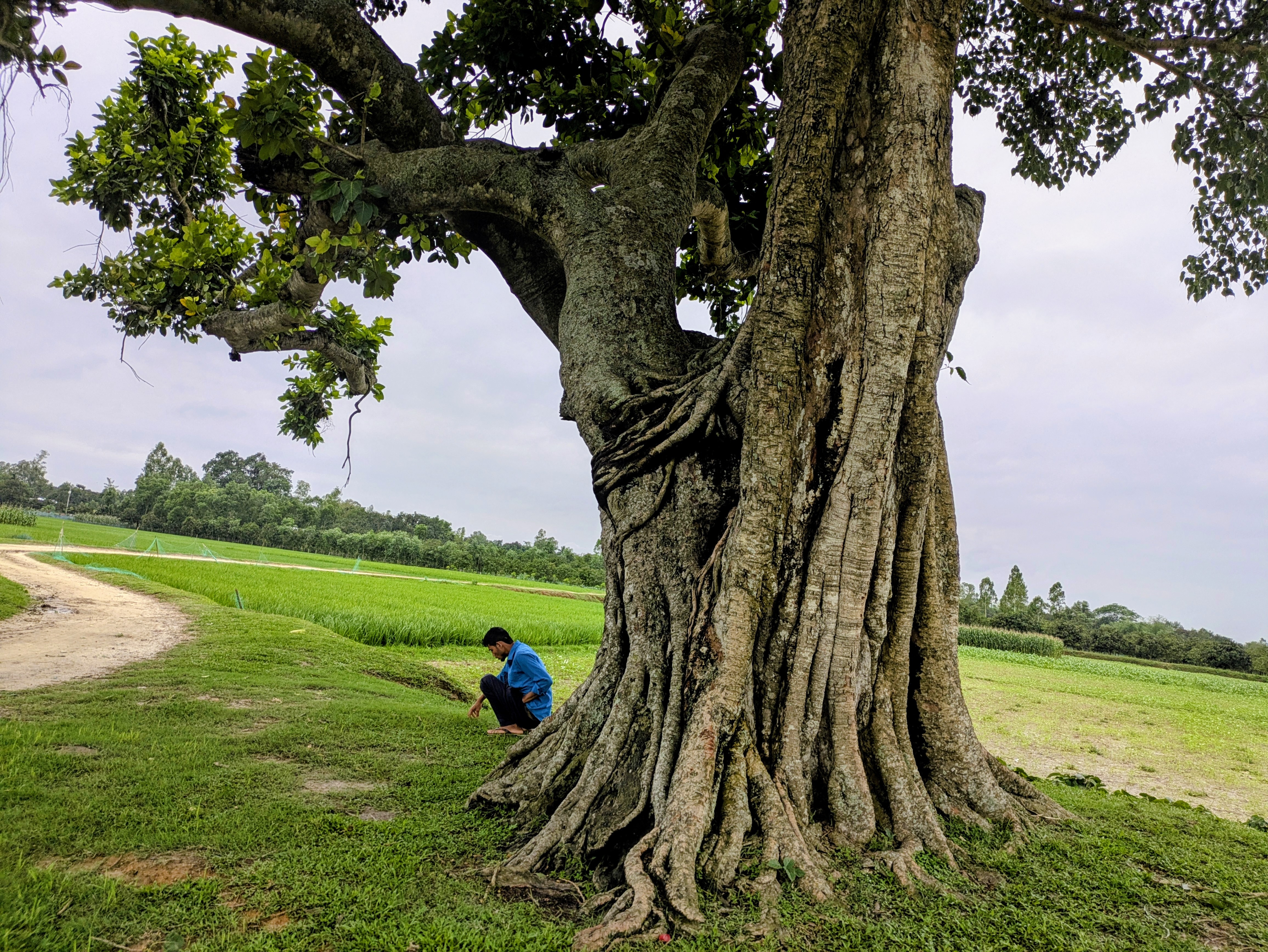 During the rainy season, when the surrounding area is filled with water and mud, this banyan tree seems to become even more alive. Its roots spread deep into the ground, and its branches spread out even more, becoming one with nature. From a distance, it seems like a huge umbrella is standing tall amidst the greenery.We have six seasons. Each season is a comfortable place for farmers sitting under this tree.This banyan tree is not only a natural beauty, it is also an important part of our village's tradition and culture. Small fairs are held here occasionally, some people make vows, and many others sit here and spend time talking.