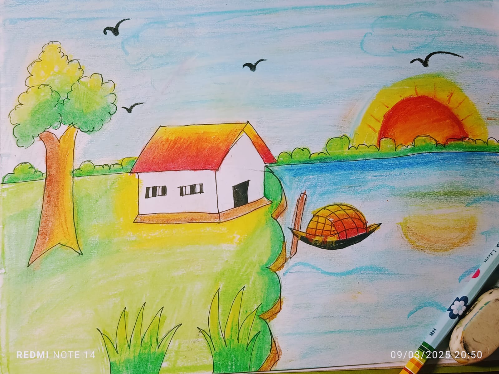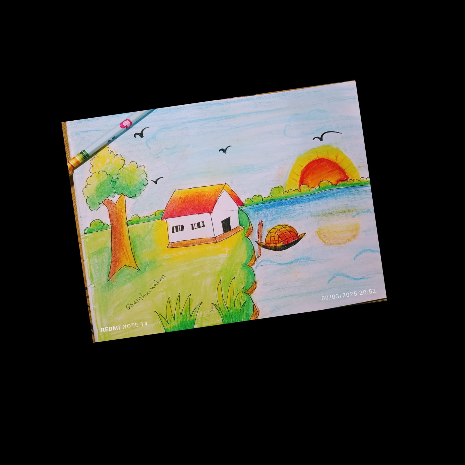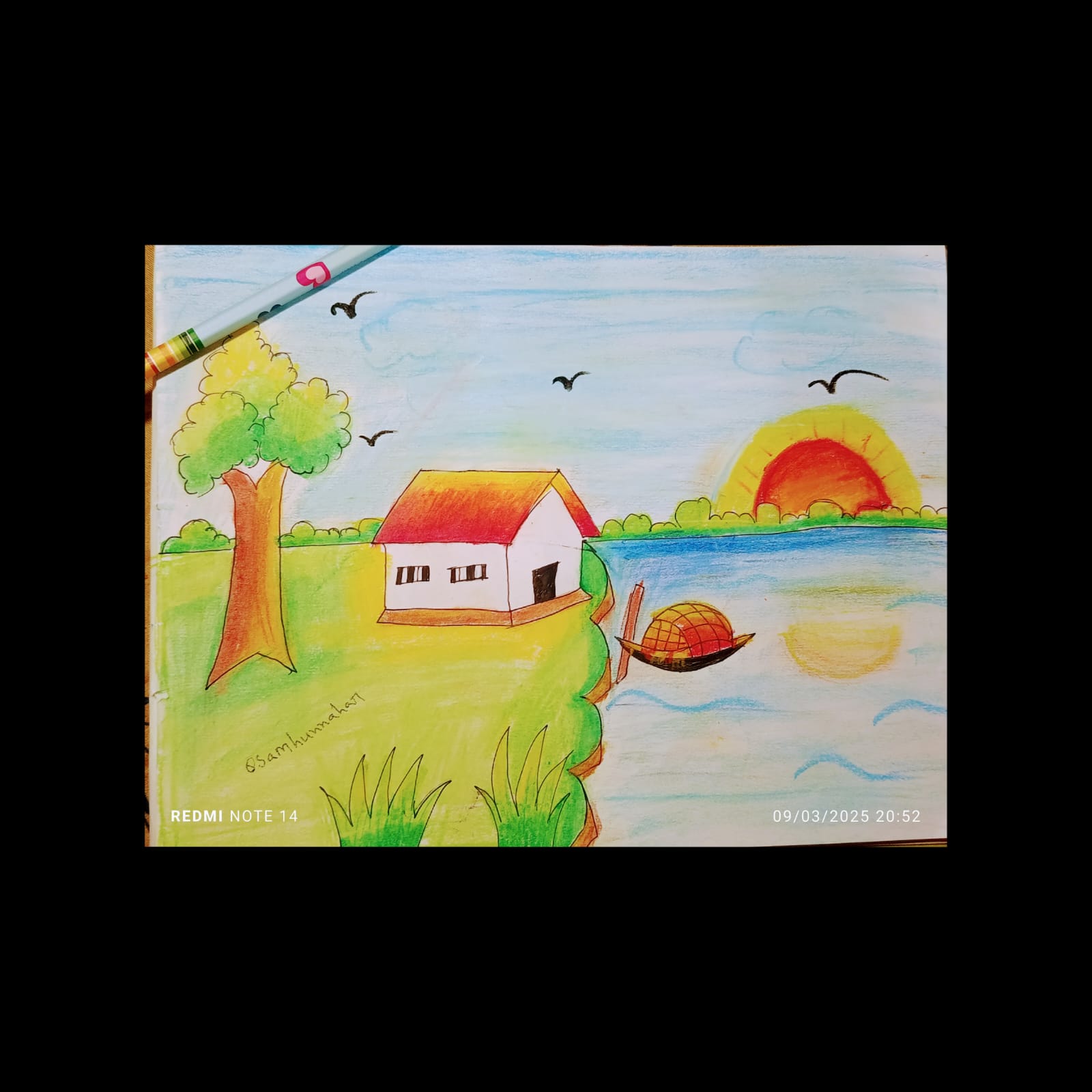 আজকে আমি আর্ট আপনাদের সাথে শেয়ার করেছি তা অবশ্যই দেখে বুঝতে পারছেন আমি একটি প্রাকৃতিক দৃশ্যের আর্ট এঁকে আপনাদের সাথে শেয়ার করার চেষ্টা করেছি। এই ধরনের কালারফুল প্রাকৃতিক দৃশ্যের আর্ট গুলো দেখতে খুবই ভালো লাগে। বিশেষ করে চারপাশের সবুজ গাছপালা নদীর সাথে নৌকা এবং আকাশের সাথে মানুষের সুন্দর সুন্দর ঘর বাড়ি। আমি প্রথমেই পেন্সিল দিয়ে পুরো আর্ট করে নিয়েছি। এরপরে চক পেন্সিল দিয়ে বিভিন্ন দৃশ্য কালার করার চেষ্টা করেছি। কালার করার পরে দেখতে খুবই সুন্দর হয়েছে।