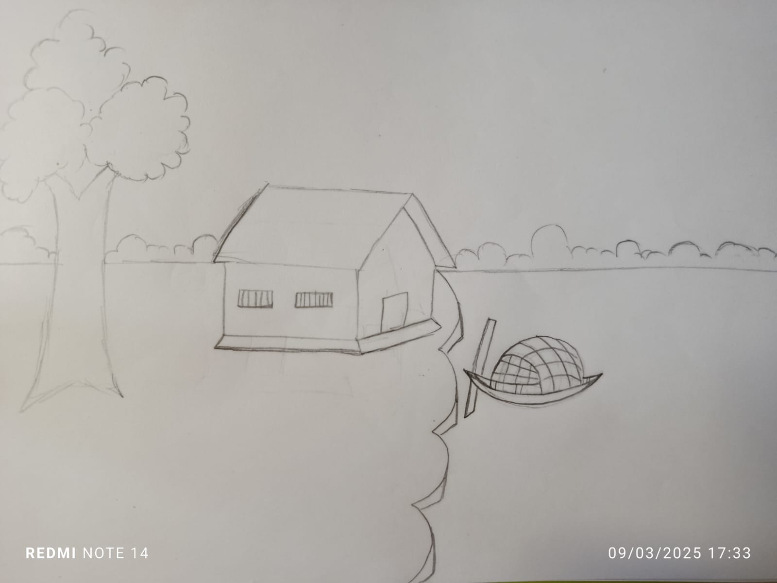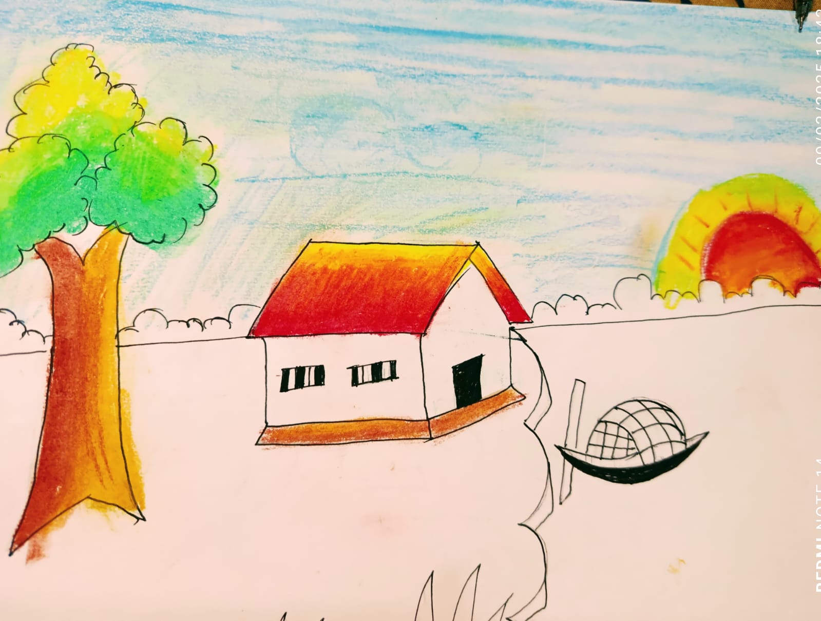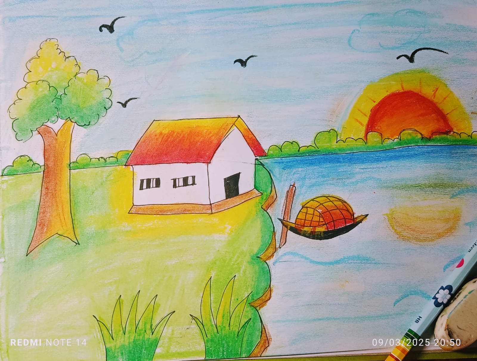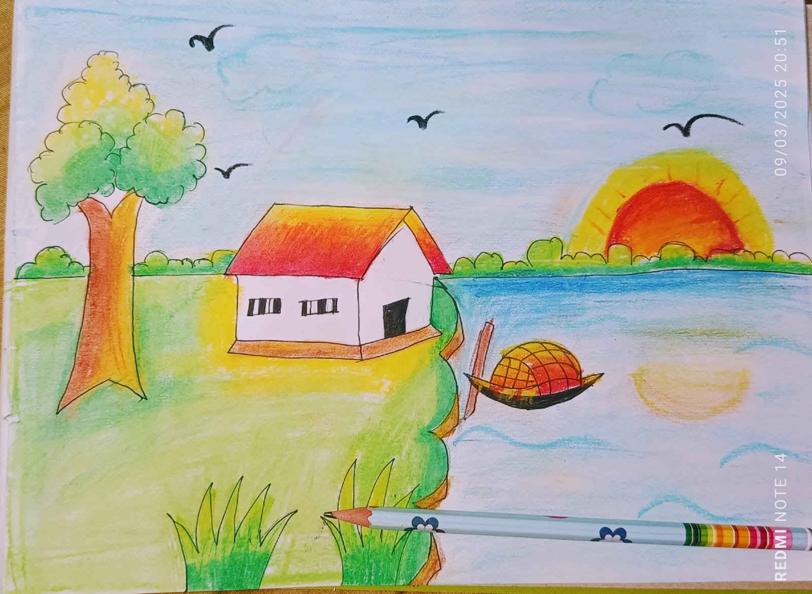 আজকে আমি আর্ট আপনাদের সাথে শেয়ার করেছি তা অবশ্যই দেখে বুঝতে পারছেন আমি একটি প্রাকৃতিক দৃশ্যের আর্ট এঁকে আপনাদের সাথে শেয়ার করার চেষ্টা করেছি। এই ধরনের কালারফুল প্রাকৃতিক দৃশ্যের আর্ট গুলো দেখতে খুবই ভালো লাগে। বিশেষ করে চারপাশের সবুজ গাছপালা নদীর সাথে নৌকা এবং আকাশের সাথে মানুষের সুন্দর সুন্দর ঘর বাড়ি। আমি প্রথমেই পেন্সিল দিয়ে পুরো আর্ট করে নিয়েছি। এরপরে চক পেন্সিল দিয়ে বিভিন্ন দৃশ্য কালার করার চেষ্টা করেছি। কালার করার পরে দেখতে খুবই সুন্দর হয়েছে।