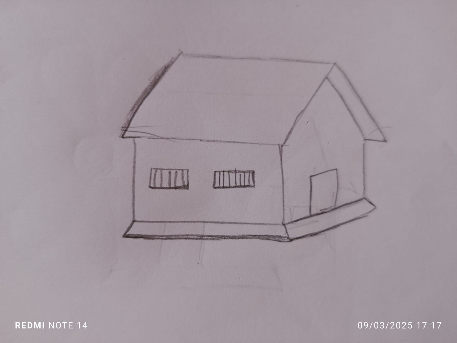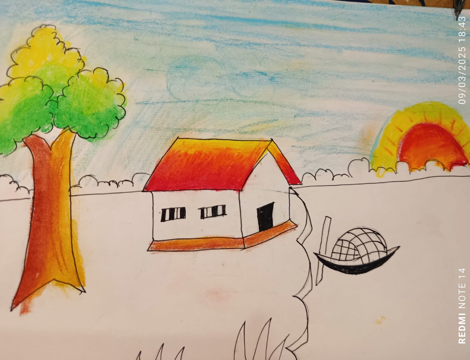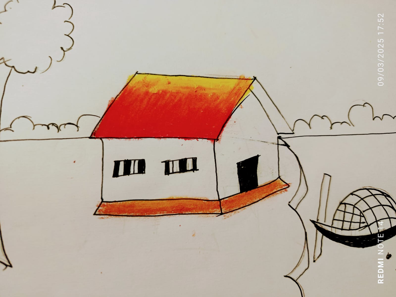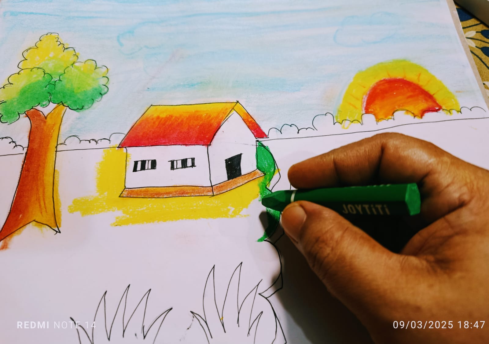 যেহেতু আগে পেন্সিল দিয়ে আর্ট করে নিয়েছি এখন চক পেন্সিল দিয়ে কালার করে নিচ্ছি। এখন দেখতে পাচ্ছেন আমি ঘরের কিছু অংশ কালার করে নিয়েছি।