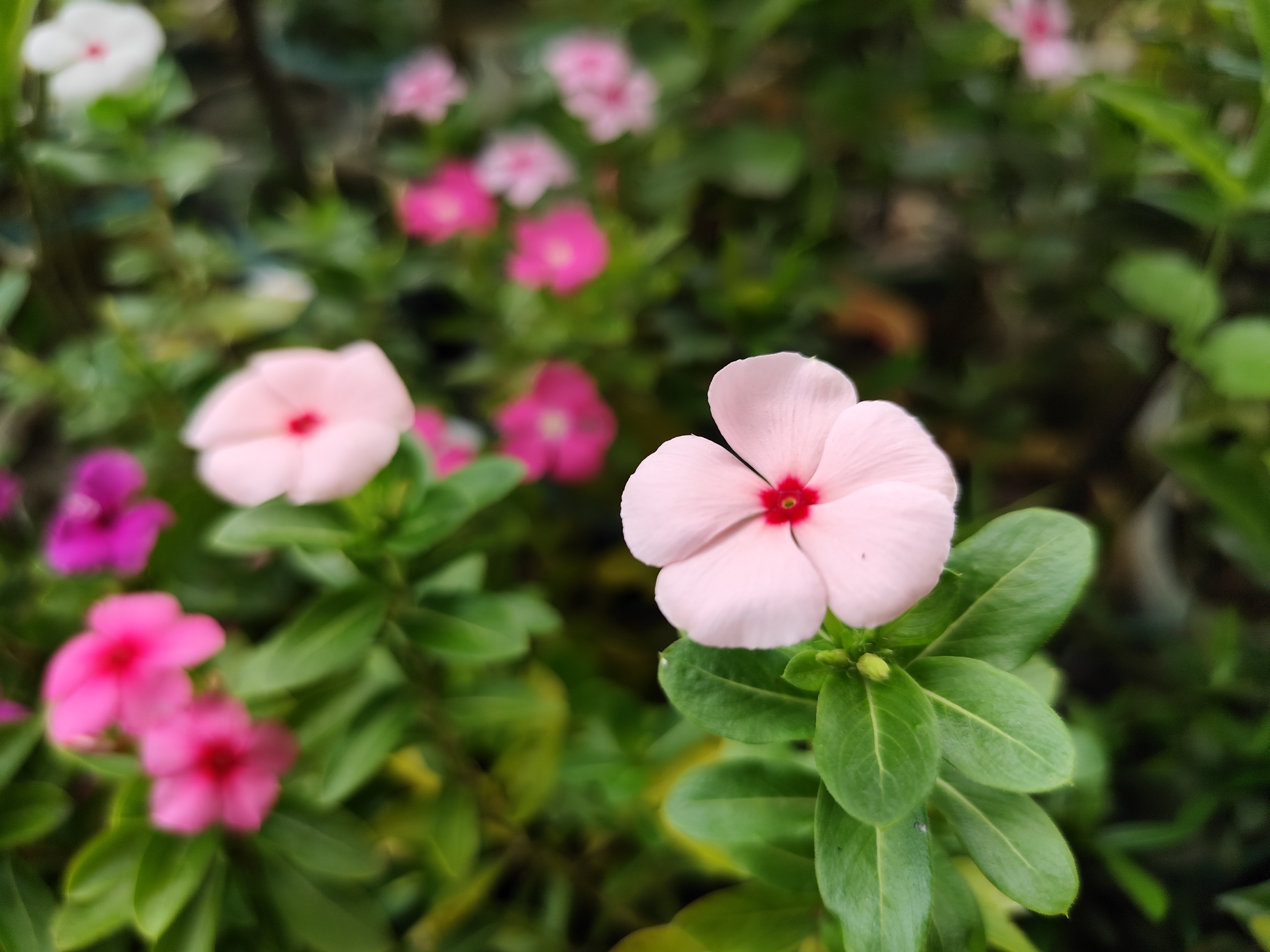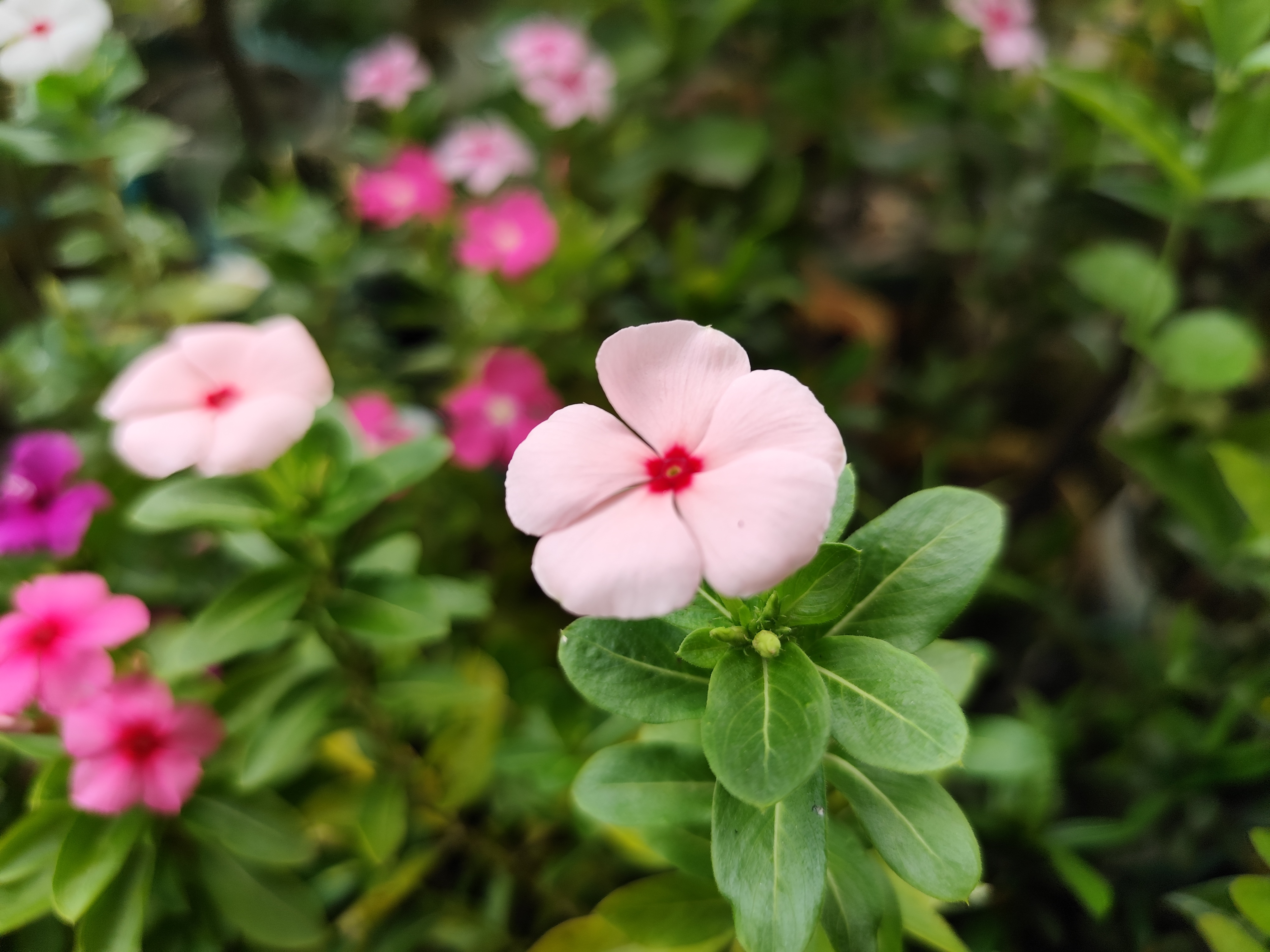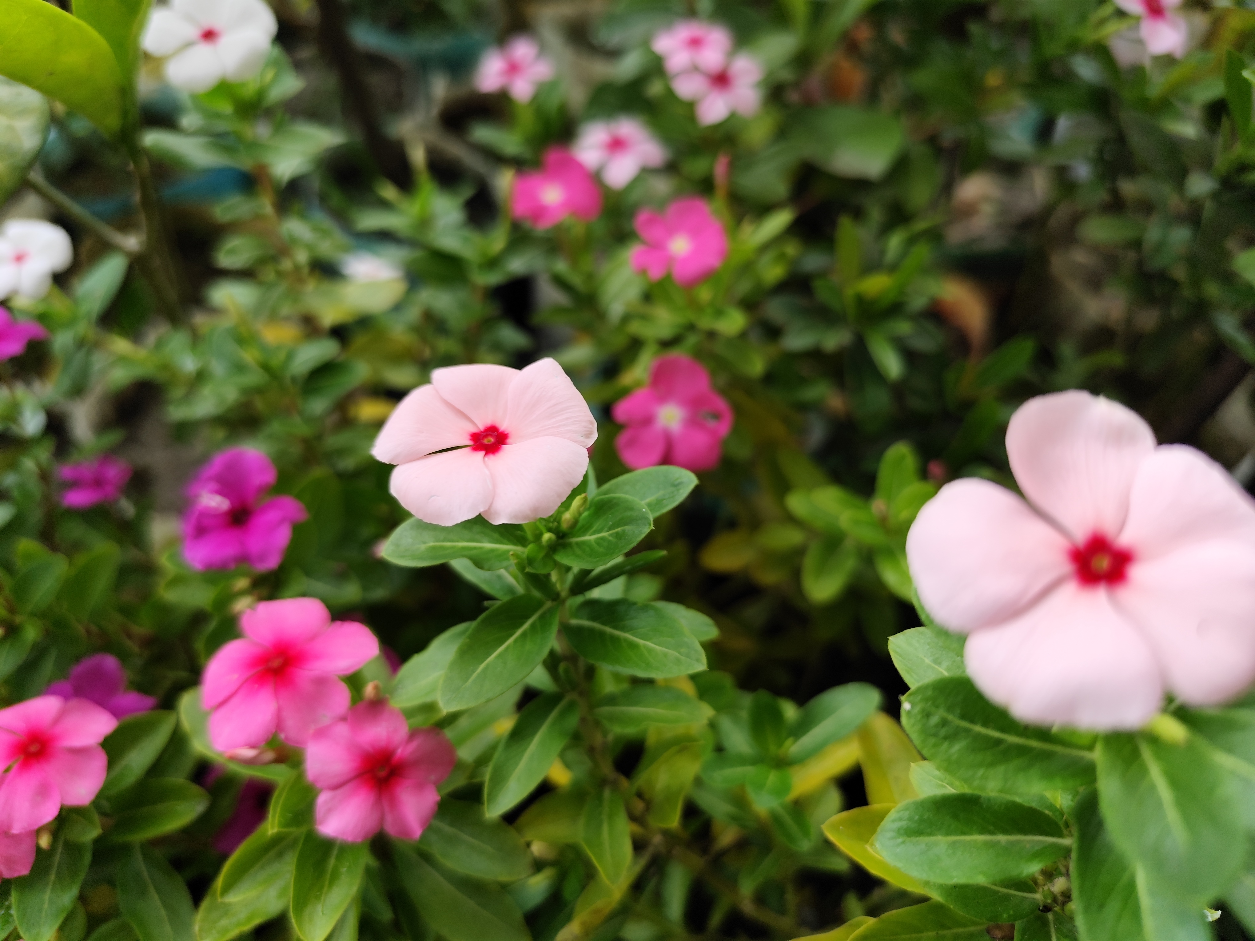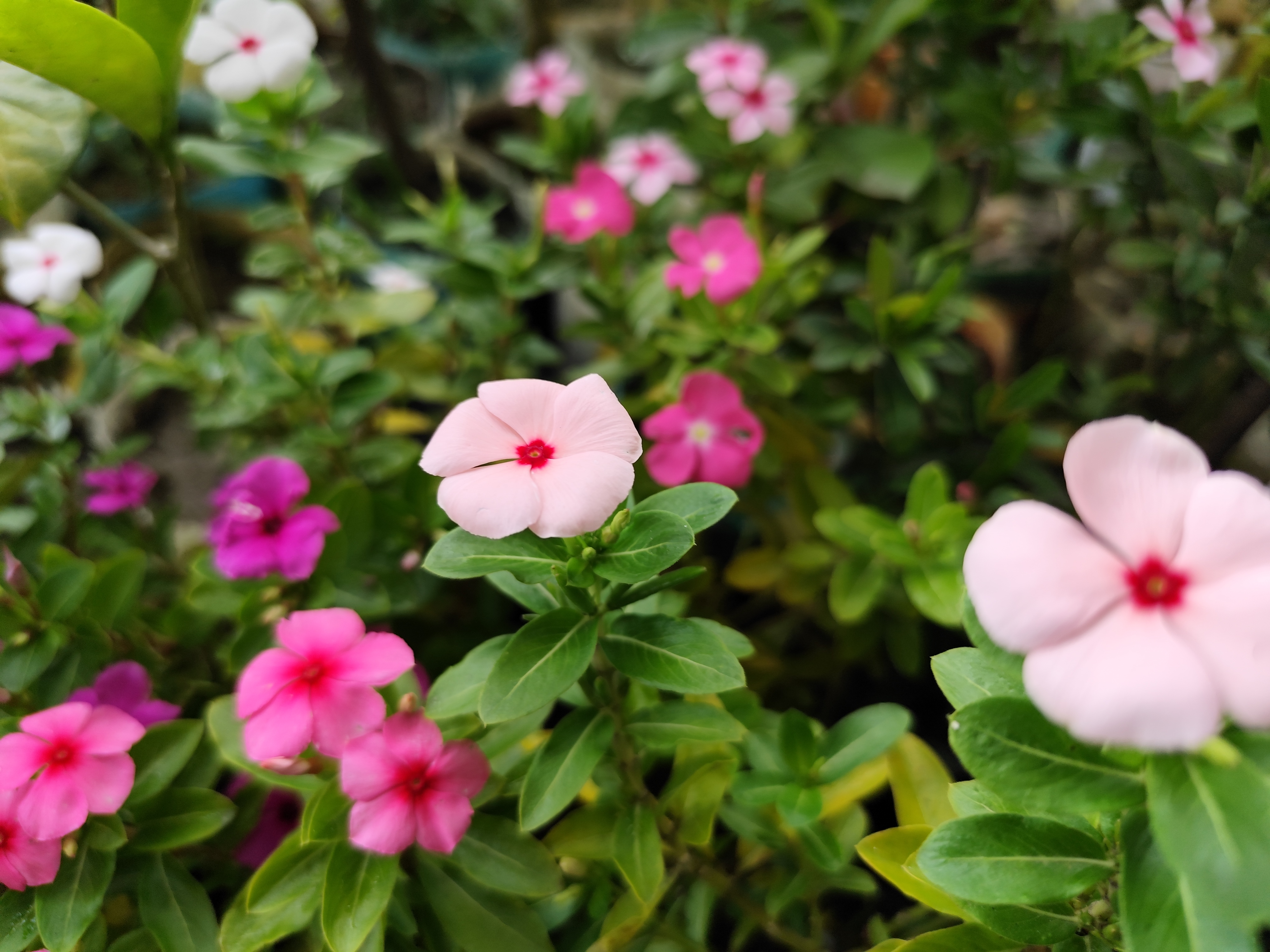 বন্ধুরা, আজকের নতুন একটি ব্লগে তোমাদের সবাইকে স্বাগতম। আজকের ব্লগে তোমাদের সাথে একটি ফটোগ্রাফি মুলক পোস্ট শেয়ার করব। আমার আজকের শেয়ার করা ফটোগ্রাফিটি হলো একটি ফুলের ফটোগ্রাফি।এর আগেও তোমাদের সাথে বেশ কয়েকটি নয়নতারা ফুলের ফটোগ্রাফি শেয়ার করেছি। এবার আমি আমার ছাদ বাগানে বিভিন্ন কালারের নয়নতারা ফুল গাছ লাগিয়েছি। যার প্রত্যেকটি প্রায় আমি তোমাদের সাথে শেয়ার করেছি। বিভিন্ন কালারের নয়ন তারা ফুল আমার অনেক ভালো লাগে। তাই আমার ছাদ বাগানে এবার বেশি করে নয়নতারা ফুল গাছ লাগিয়েছি। একসাথে ভিন্ন ভিন্ন কালারের নয়নতারা ফুল দেখতে বেশ ভালই লাগে। যেমন আমার আজকের শেয়ার করা নয়নতারা ফুলটি হালকা গোলাপি কালারের। তবে হালকা গোলাপির ভেতরে গাঢ় গোলাপি কালারও রয়েছে। একটি ফুলে দুটি ভিন্ন ভিন্ন কালার। নয়নতারা ফুল গাছে কম বেশি সবসময়ই ফুল ফোটে। তবে এই ফুল যে শুধু দেখতে সুন্দর তা নয় এই ফুলের পাতার অনেক ভেষজ ঔষধি গুনাগুন রয়েছে। গত কয়েকদিন ধরে বেশ ভালই বৃষ্টি হচ্ছে। যার ফলে গাছের পাতা গুলো অনেক বেশি সজীব হয়ে উঠেছে। আর আমার আজকে শেয়ার করা ফুলের পেছনে তোমরা খেয়াল করলে দেখতে পাবে আরও বিভিন্ন কালারের ফুল ফুটে রয়েছে। বৃষ্টিতে ভেজা সবুজ পাতার মাঝে এসব বিভিন্ন কালারের নয়ন তারা ফুল দেখে সত্যি মুগ্ধ হওয়ার মতো। ক্যামেরায় যদিও ঠিক করে অতটাও বোঝা যাচ্ছে না। তবে সামনে থেকে দেখতে অসম্ভব সুন্দর লাগছিল। যাইহোক, আজকে সকাল বেলা আমি ছাদে গিয়ে ভিন্ন ভিন্ন কালারের অসংখ্য নয়নতারা ফুলের এই মনমুগ্ধকর দৃশ্য দেখতে পাই। সেই সময় কিছু ফটোগ্রাফি করে নেই। আর যা আজকের এই ব্লগে তোমাদের সাথে শেয়ার করলাম।