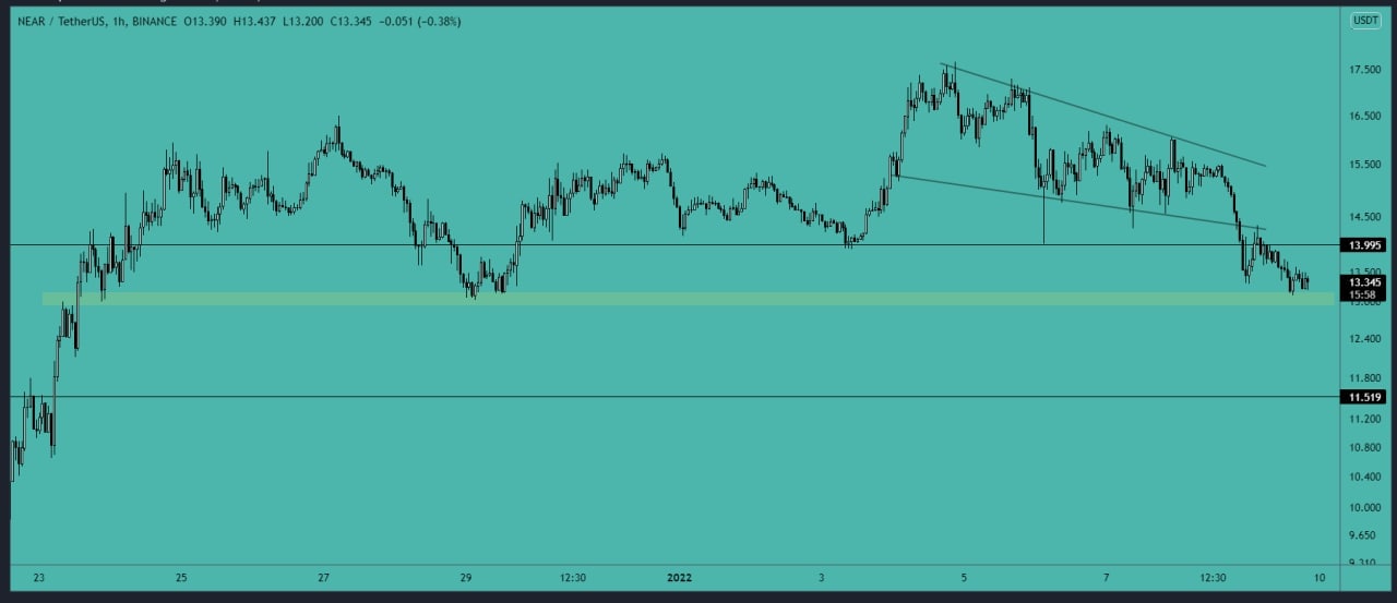 NEAR Analysisazhardgamer (26)in #near • 4 years ago NEAR unable to hold the $14 support area and now testing the $13-$13.2 support area. The next support is $11.5 area. The first resistance is now $14-$14.25 area. New entry is risky now and use tight stop loss if you want to open a new position.