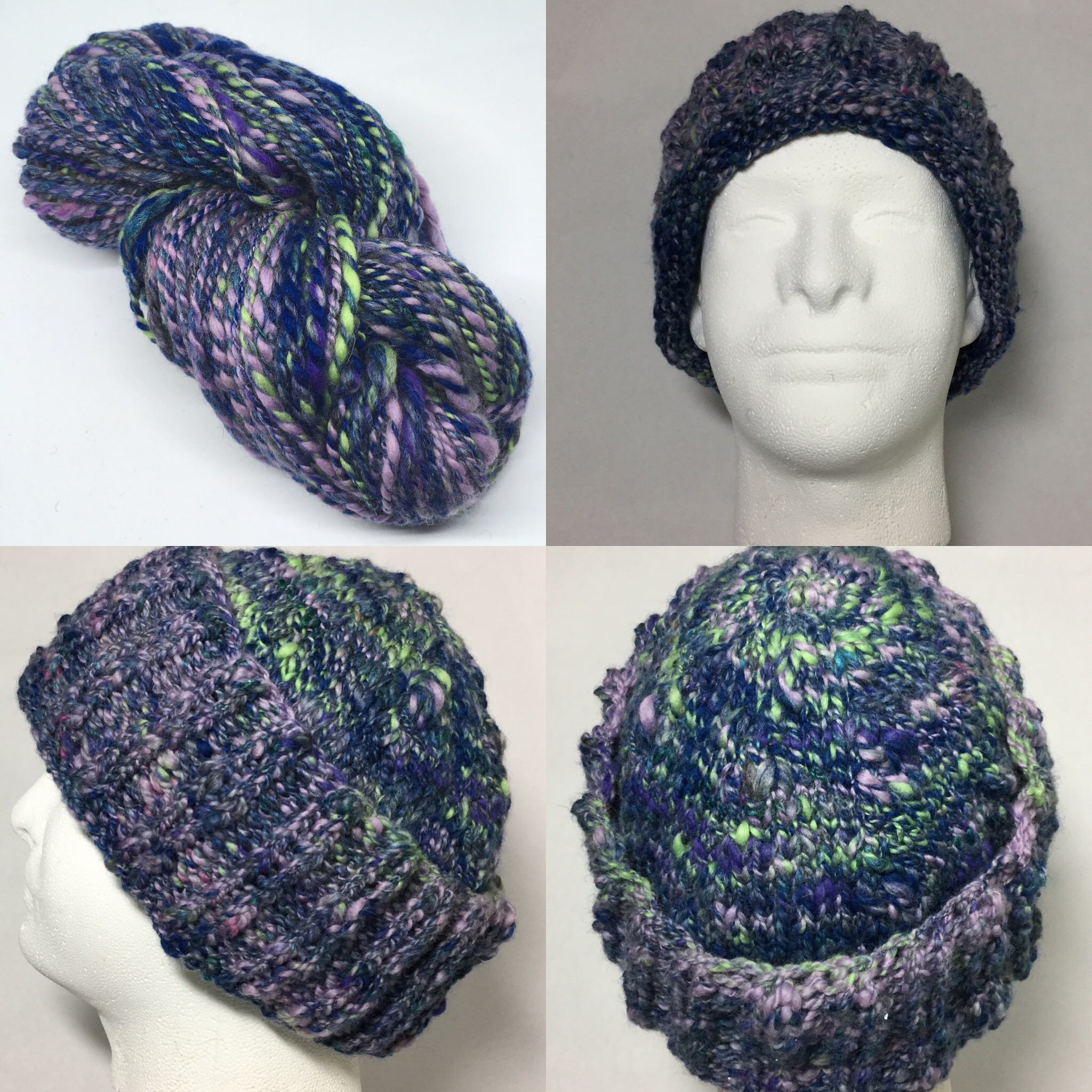 Who doesn't love purples and lime green?! This moreno blend came from a fiber waste bag I purchased on Etsy. When all was said and done I had two awesome skiens of yarn that both knitted up into two totally fabulous hats. While the blend had more than just the purples and the green I worked hard to make sure those colors stood our the most. How awesome is that! Viva la waste fibers!