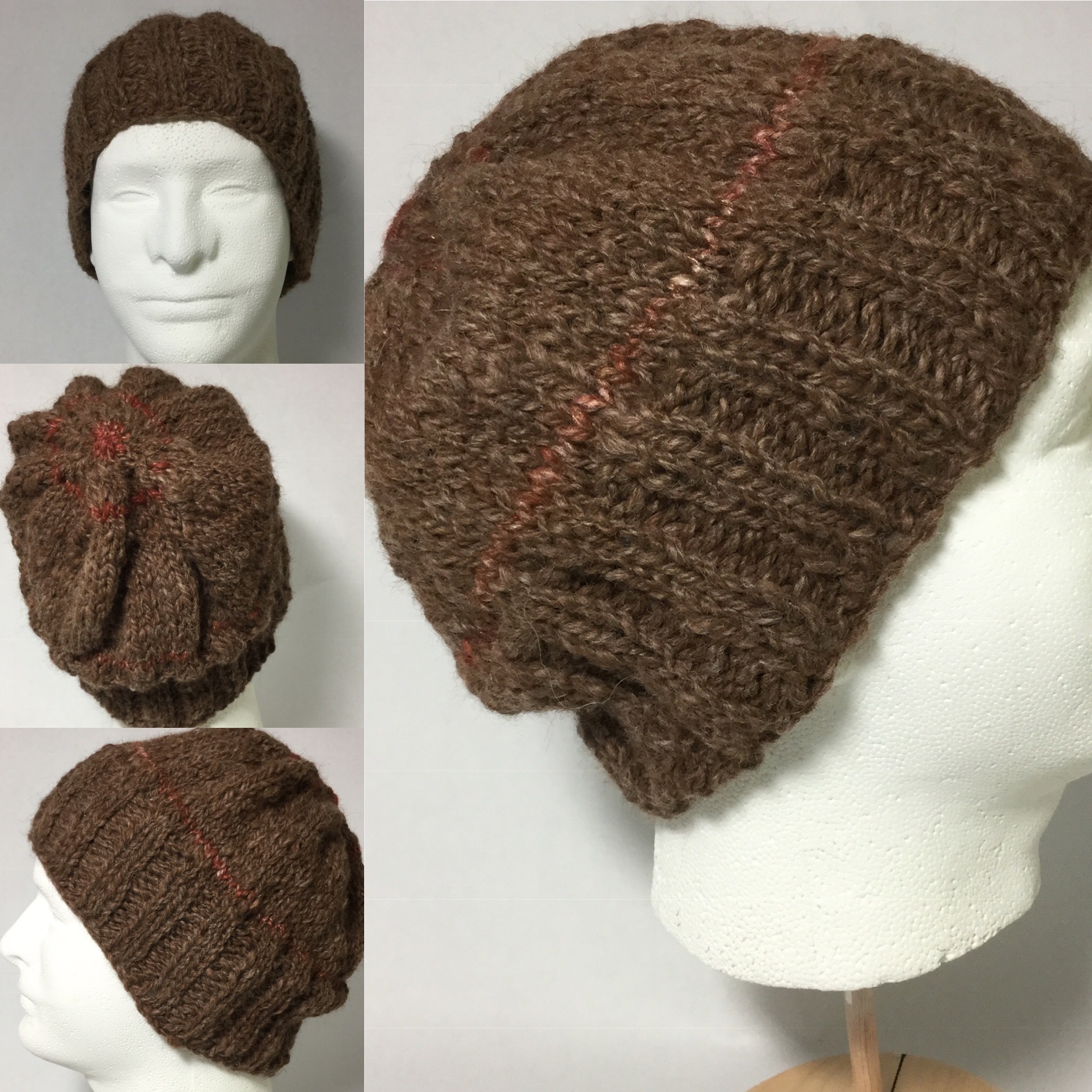 I have no idea where I picked up the fiber blend I made this hat out of. This is a blend of alpaca, and wool. I do know that this hat was a dream to spin and wonderful to knit. I love the sheen of this hat and its handle. The weight and warmth and softness make this hat a winner for me.