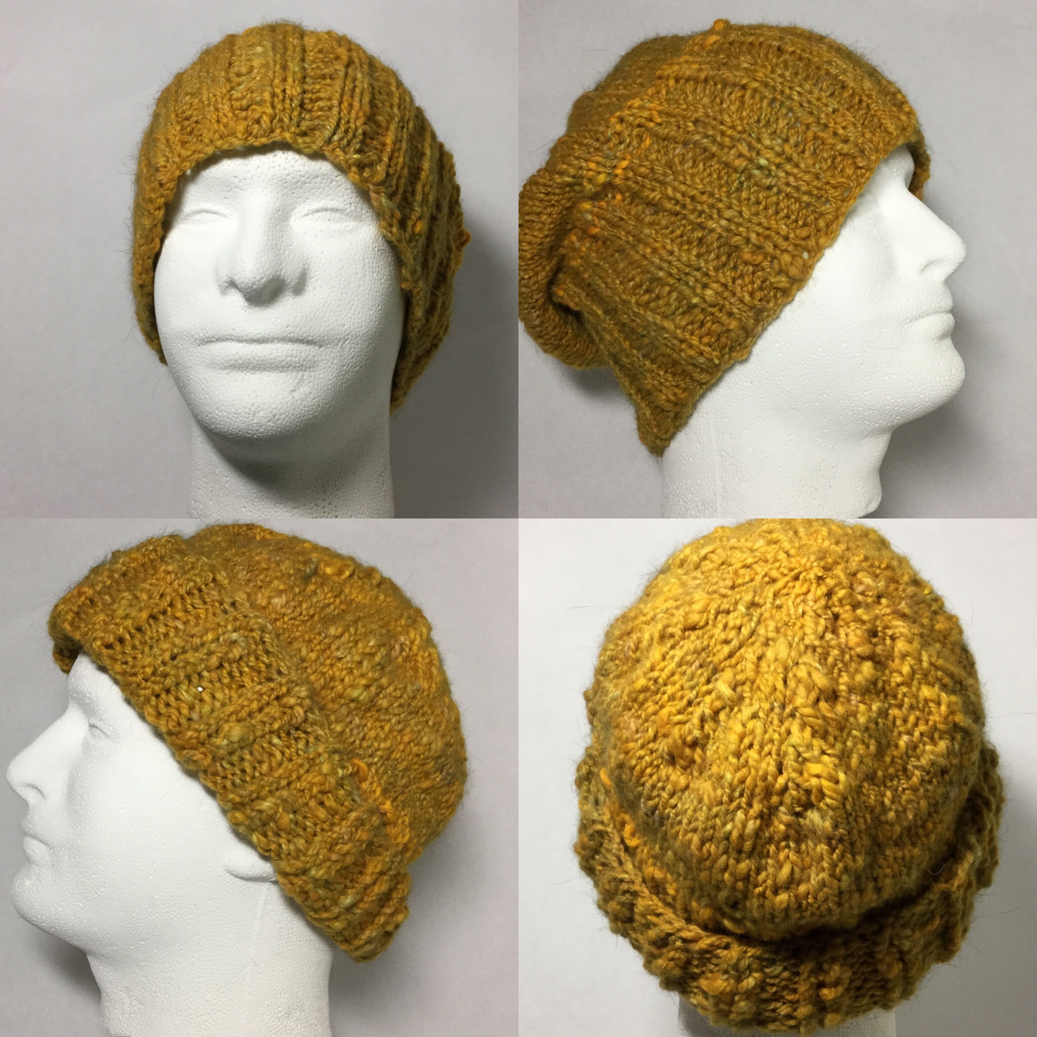 I decided to call this one "dijon corn". You can see why. I had white and yellow Moreno wool with some angora and silk blended up and spun into yarn. I thought to myself "lets toss this into the dye pot with some brown. Thinking of how awesome this would be. Well, that wasn't the brown I grabbed. I realized my mistake as the yarn went in. I decided to keep the resulting color as is simply because I never had anything that color before. This hat is still sinfully soft and warm so no regrets. well, I do make it a point to pay better attention when I am dyeing now.
