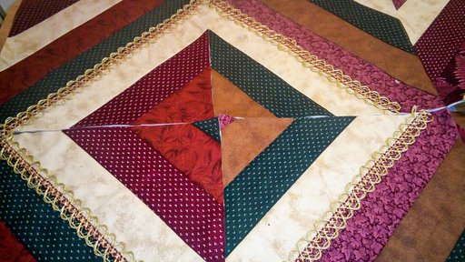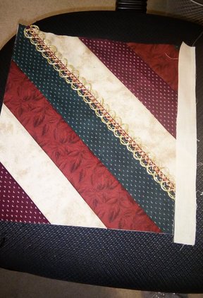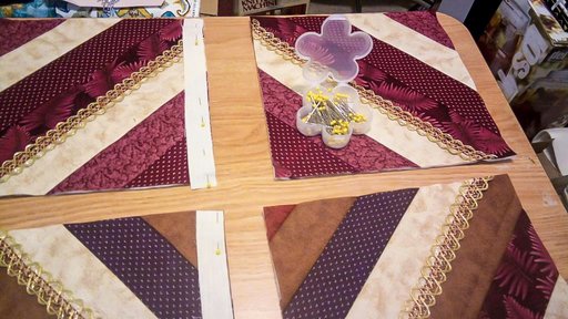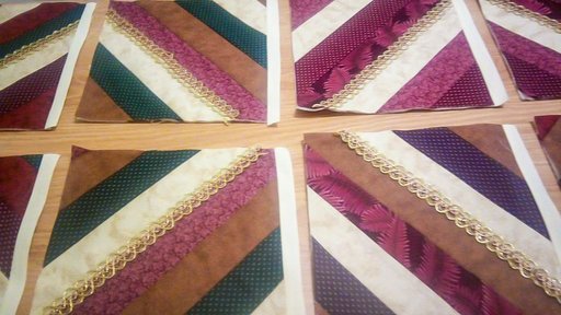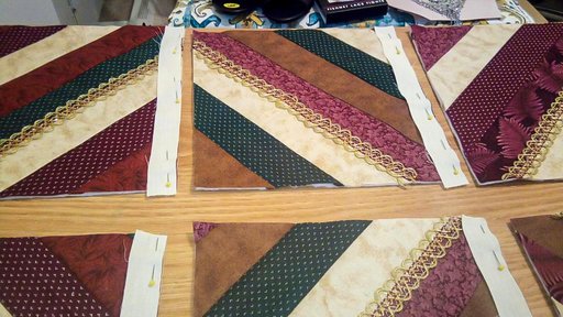 She wanted to added a touch of lace. When stitching the lace, line it up to the seam of the block you prefer it to be on. Pin the lace on the seam and sew it on stitching in the middle of the lace staying on the seam. Do all of your lace on each block until all of it is sewed on.
