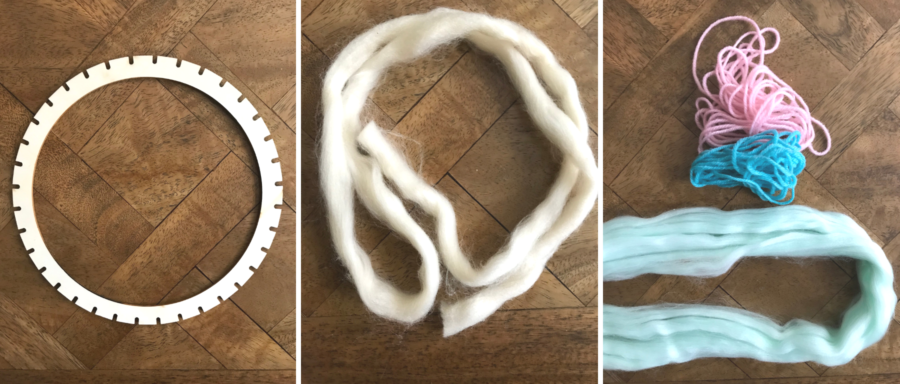 The kit consists of a wooden frame and some raw wool and acrylic yarns. It has no explanation, but the cover photo shows an example of the finished mandala, so I had no problem to set this weaving loom up.