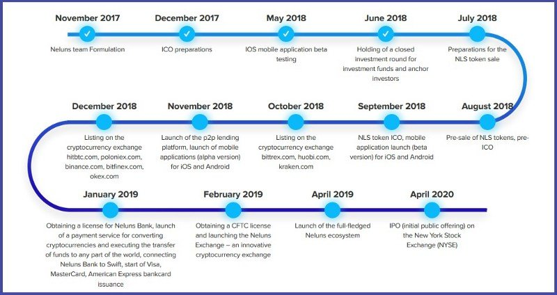 Obtaining a license for Neluns Bank, launch of a payment service for converting cryptocurrencies and executing the transfer of funds to any part of the world, connecting Neluns Bank to Swift, start of Visa, MasterCard, American Express bankcard issuance