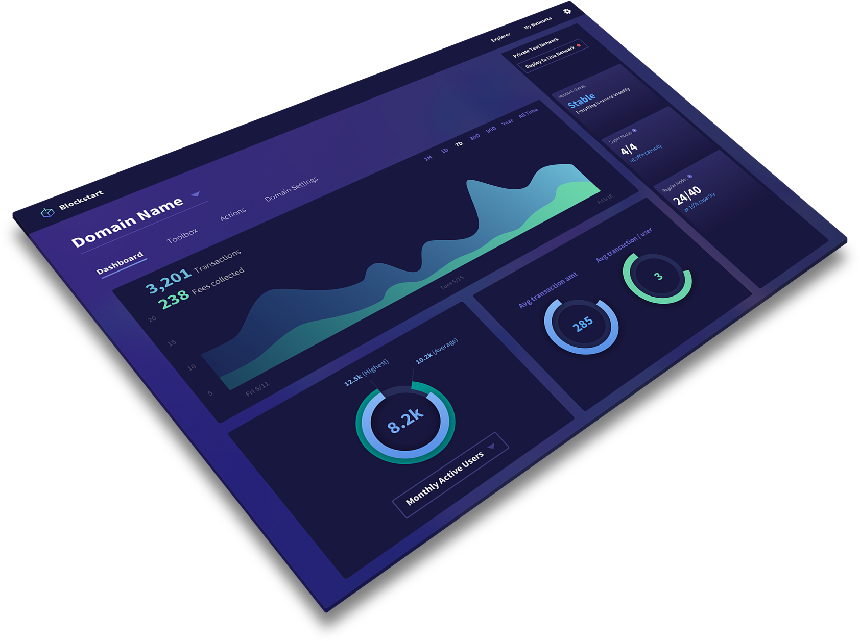 From this dashboard, developers and members of the company can view analytics powered by their blockchain, information like number of transactions, fees, user count, and nodes. Rather than have your info jumbled into the public Etheruem chain, you can cleanly monitor your progress in your own blockchain. Pretty cool.
