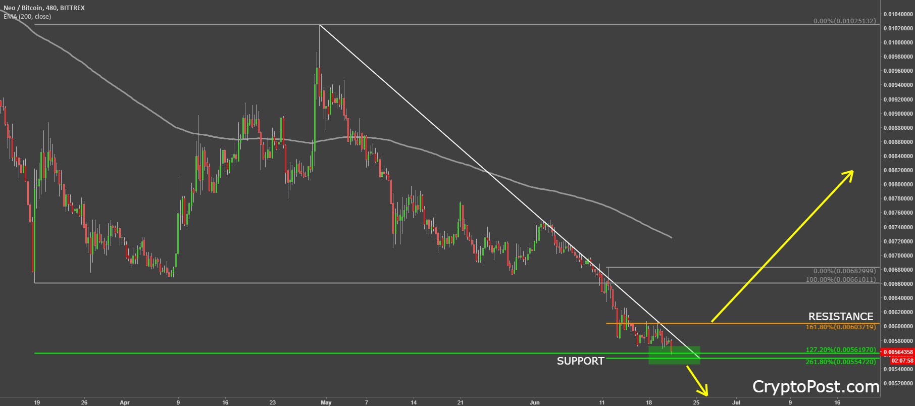 Today NEO has approached strong support area, which could be a decision point for the upcoming move. The support is based at btc 0.0055 area, which is confirmed by two Fibonacci retracement levels.