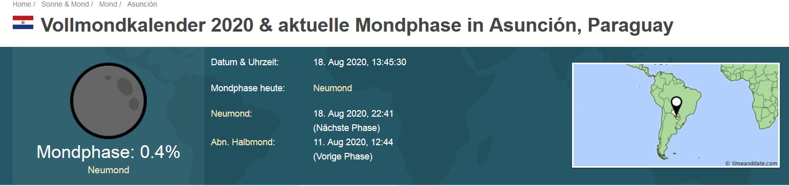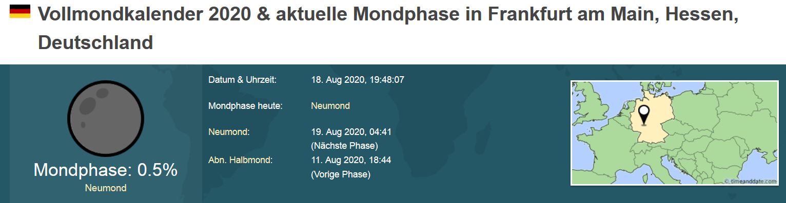 Da habe ich dann tatsächlich fast den Zeitpunkt verpasst und mich auf den 19. August fixiert. Dabei ist die Neumondphase auf der ganzen Welt gleich und hält sich nicht an weltenbürgerliche Zeitzonen. Hier ist es bereits heute um 22.41 Uhr soweit.
