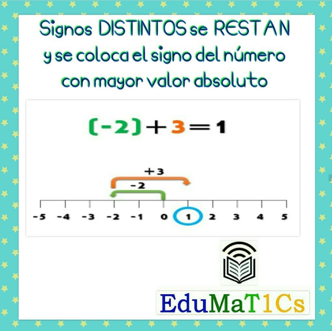 Signos DISTINTOS se RESTAN y se coloca el signo del número con mayor valor absoluto.