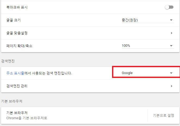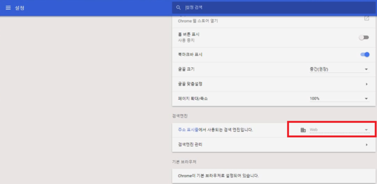 다잡아프로그램 치료후 "크롬 - 설정"의 검색엔진을 다시 들어가 보았습니다.