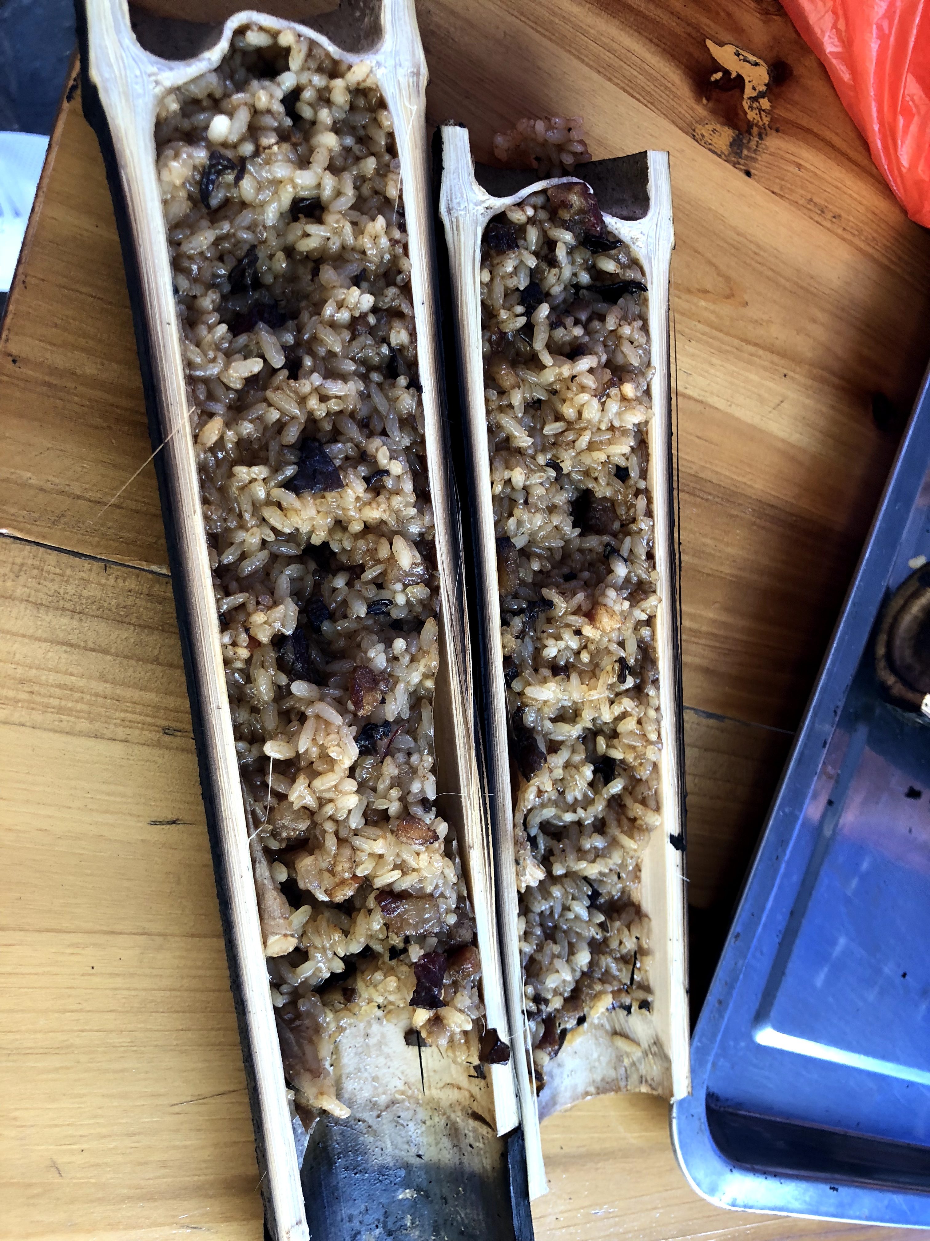 The food might be delicious, when you say "bamboo tube chicken and rice" does it mean that chicken and rice were packed into bamboo and then cooked in it using bamboo like a cooking device? That seems to be very handy when someone if in wildness and has no kitchen and cooking pots.