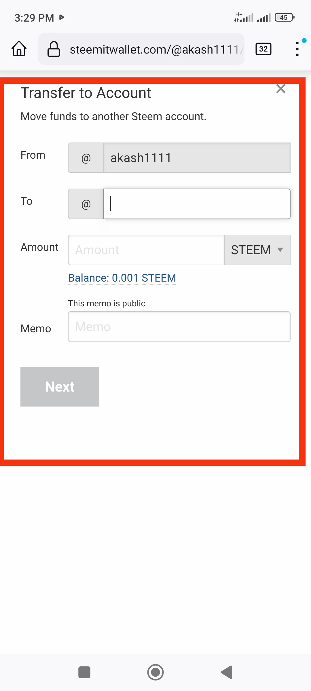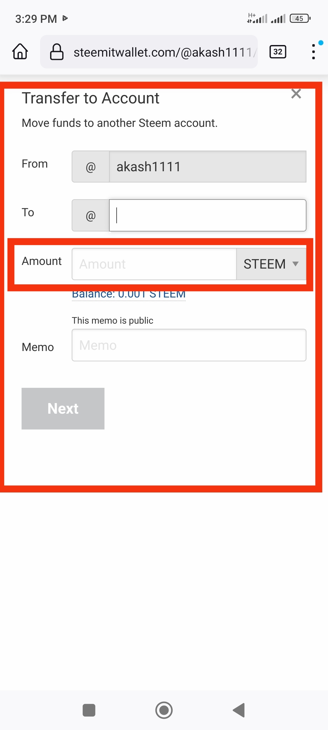 Then enter the amount you want to steam and the username of the person you want to transfer to. Then put your memo key in the memo box below. Then click on Next button.