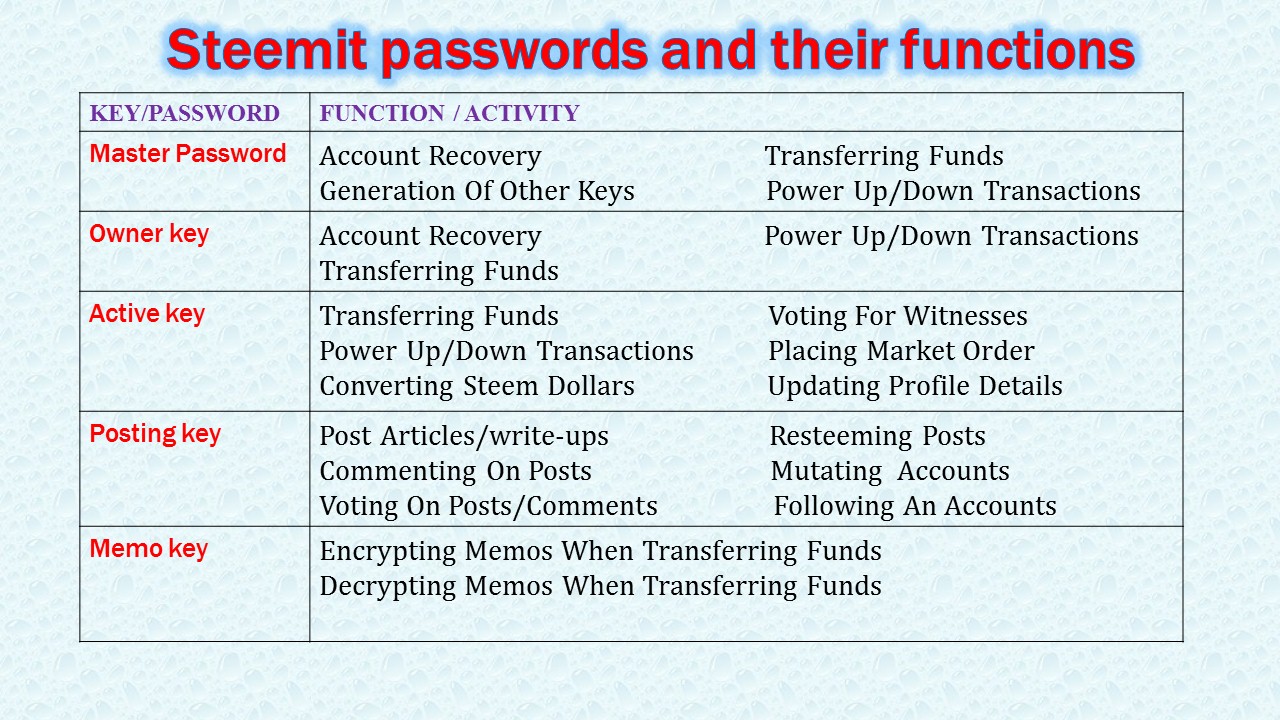 One may ask how a Master password differs from an Owner key. The answer is that all the other keys, including owner keys, are generated from the master password with the exception of none as the name suggests. The master password becomes handy during an account recovery, where would have to take it to steemit.com wallet for the retrieval of all the other keys.