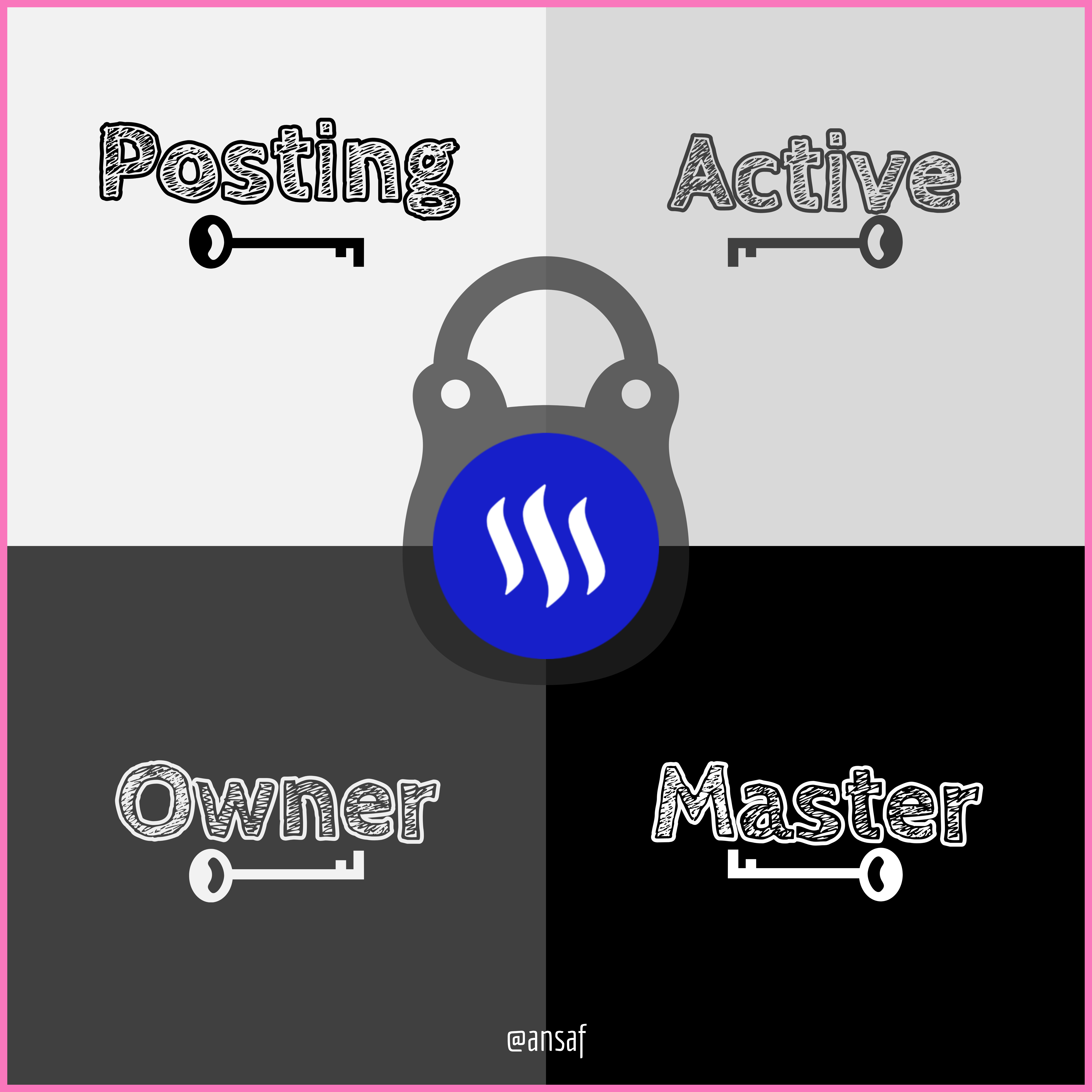 Steemit security is well based on a set of different types of keys . Posting key , Active key , Owner key & the Master Key.