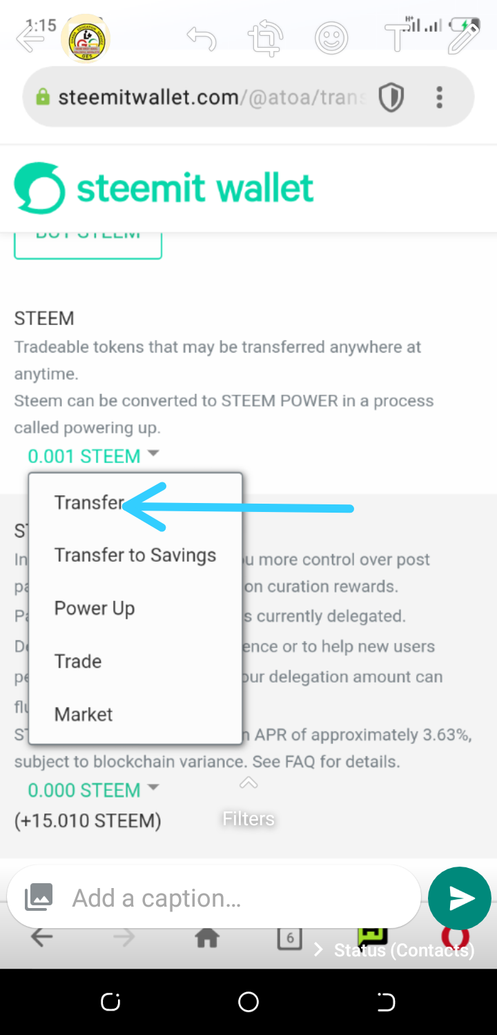 Transfering tokens from one account to another account, click on the wallet a pop menu appears,click on steem arrow and another pop menu will appear, click on transfer in the pop menu that has appear and then the transfer form is open for activity to be perform.