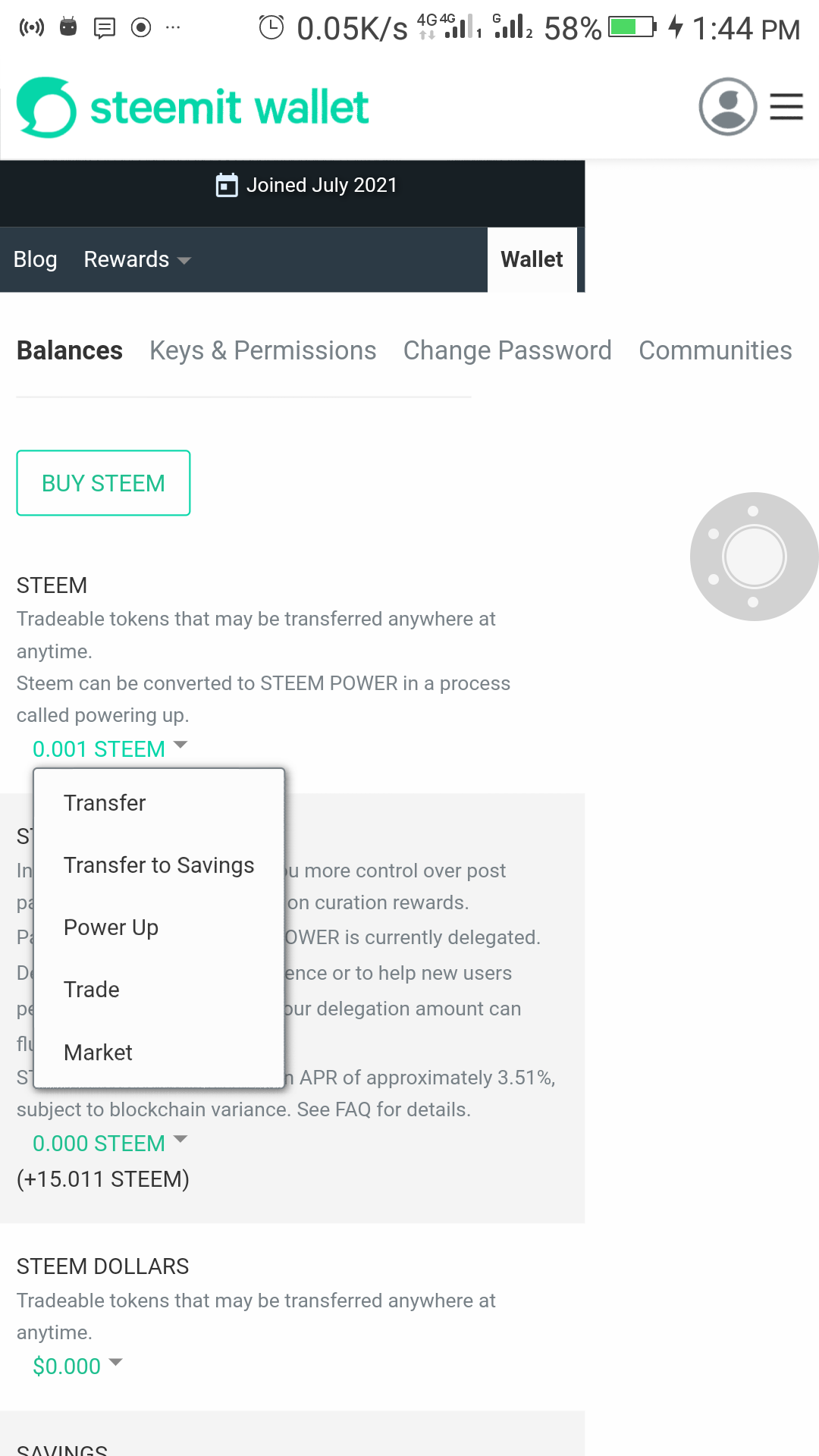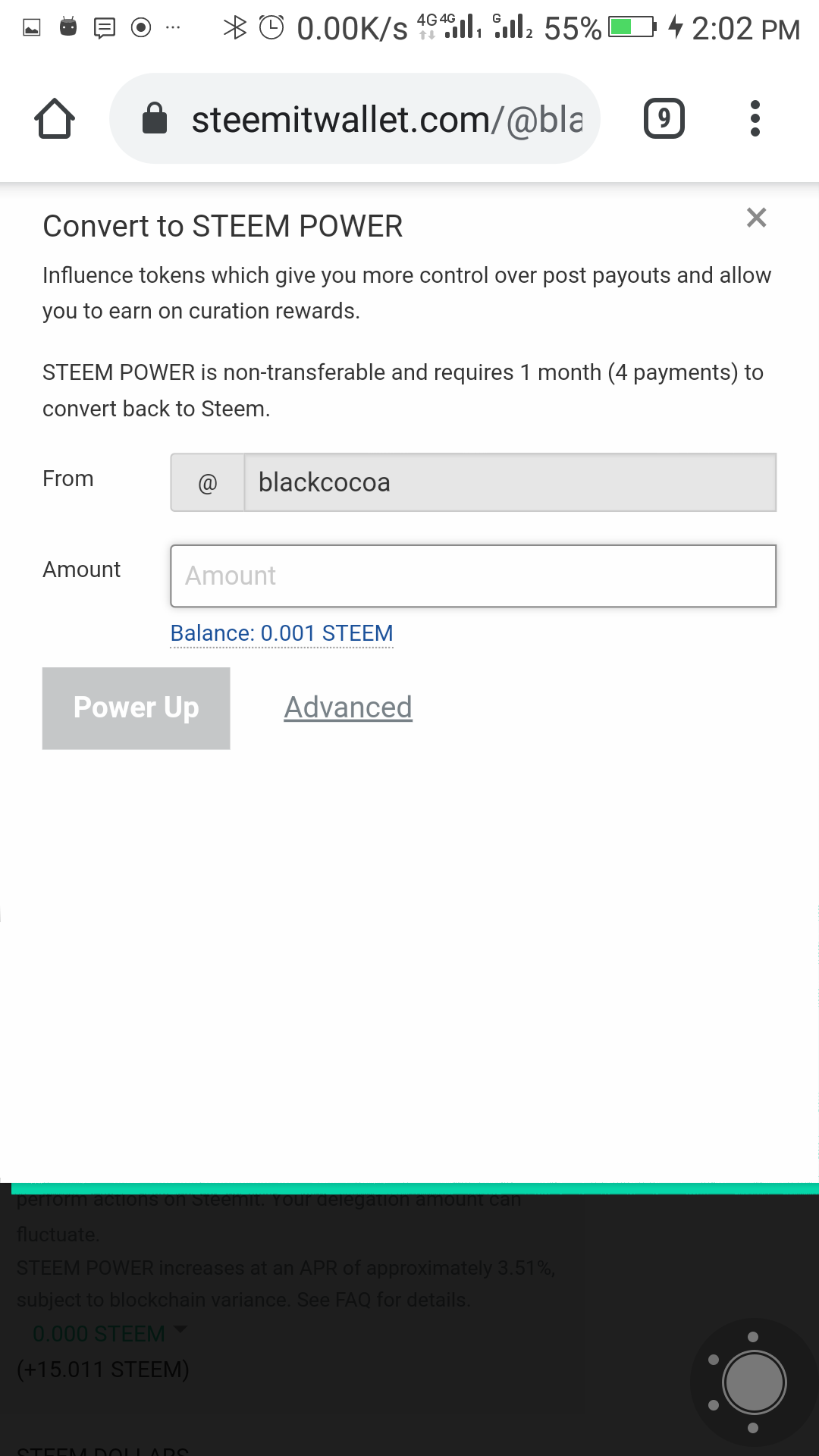 -Click on the drop down button besides your steem value,click on the power up button (note that this will ask you how much of the liquid steel you want to power up)