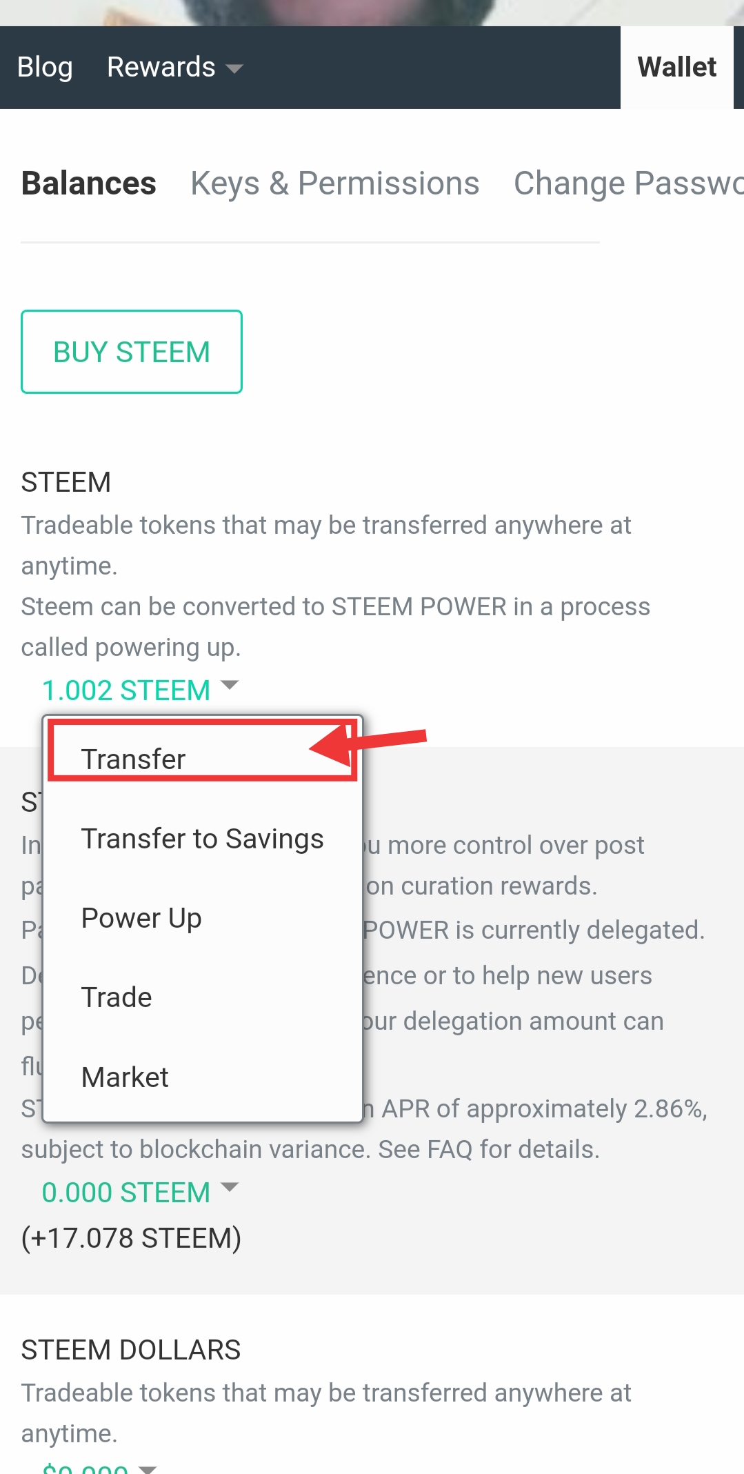 Step 2: From the wallet, I then clicked on "STEEM" and then "Transfer."
