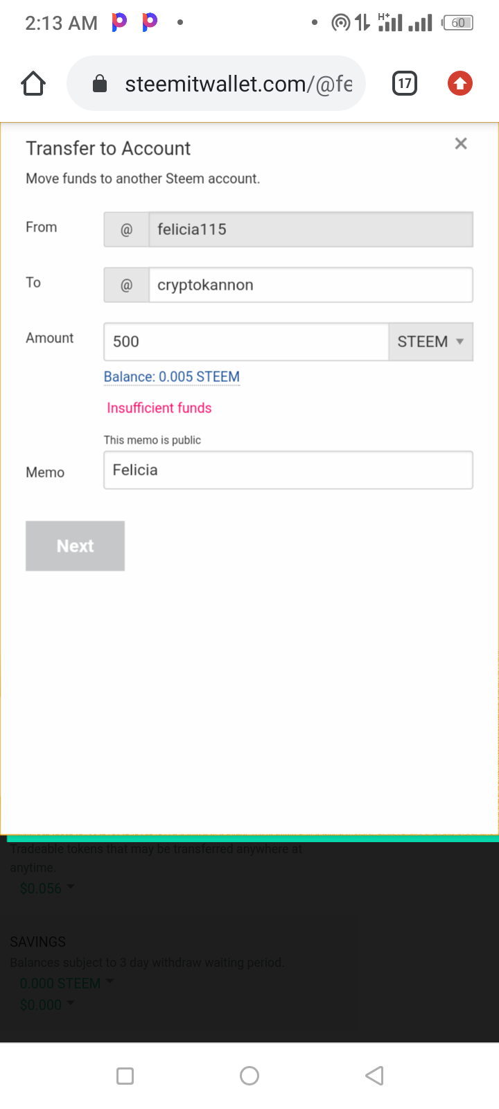 STEP FOUR: In the menu that appears type the username of the account you are transferring the steem token to.