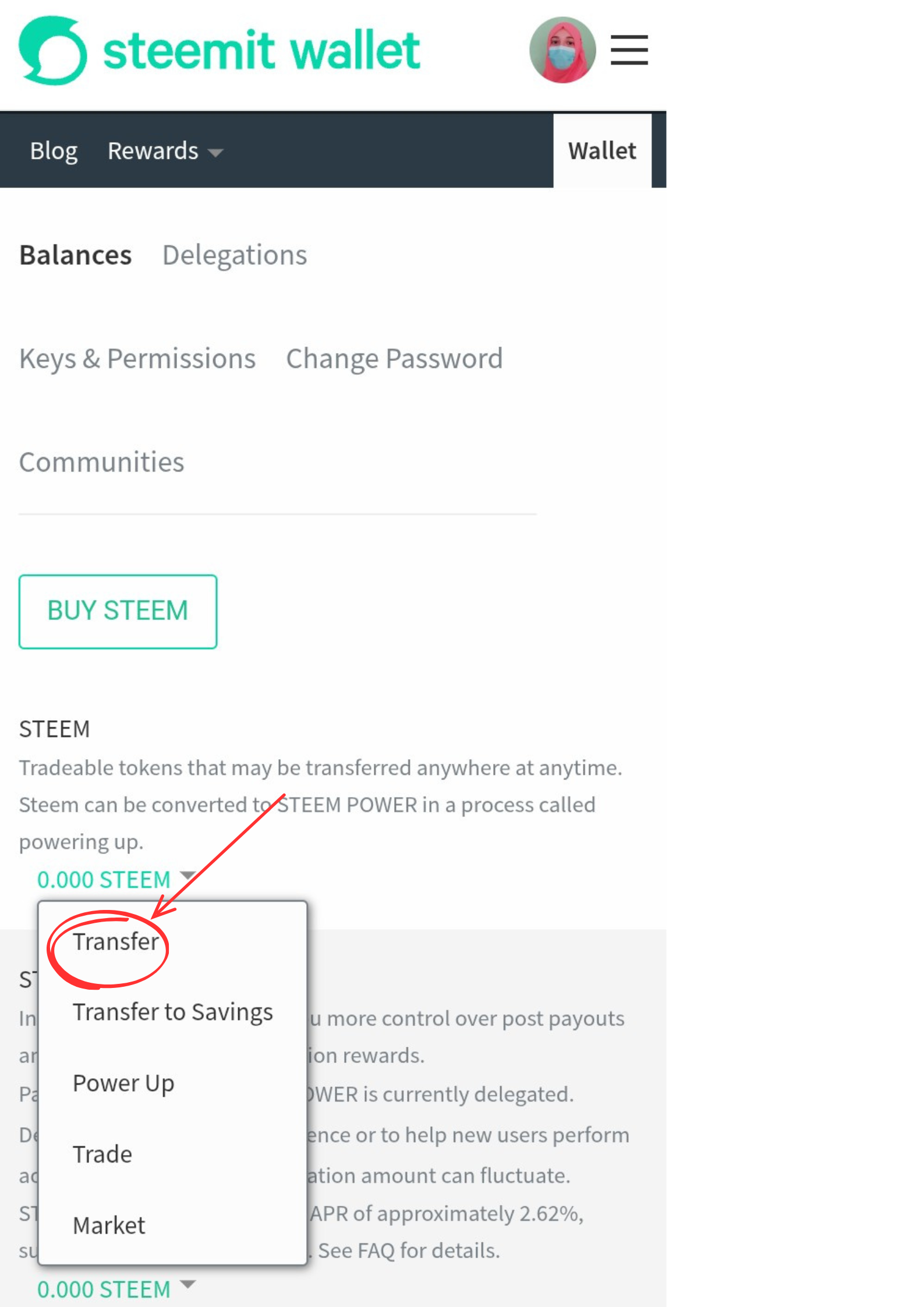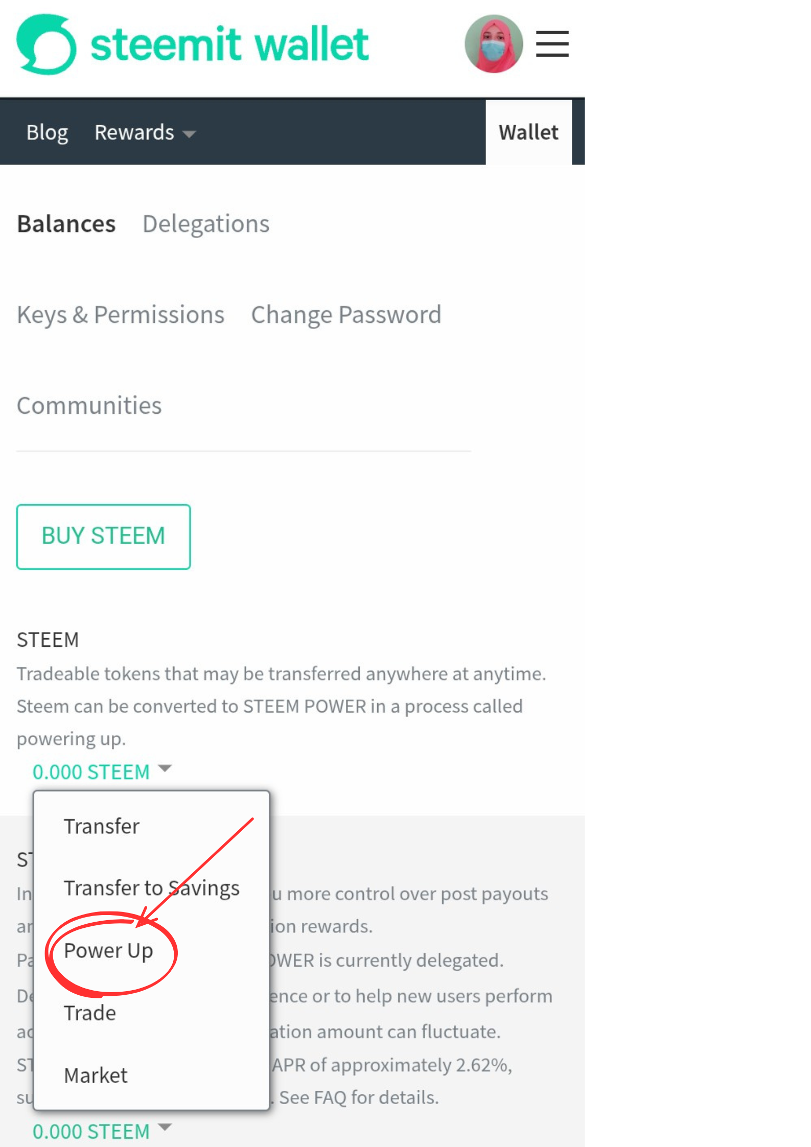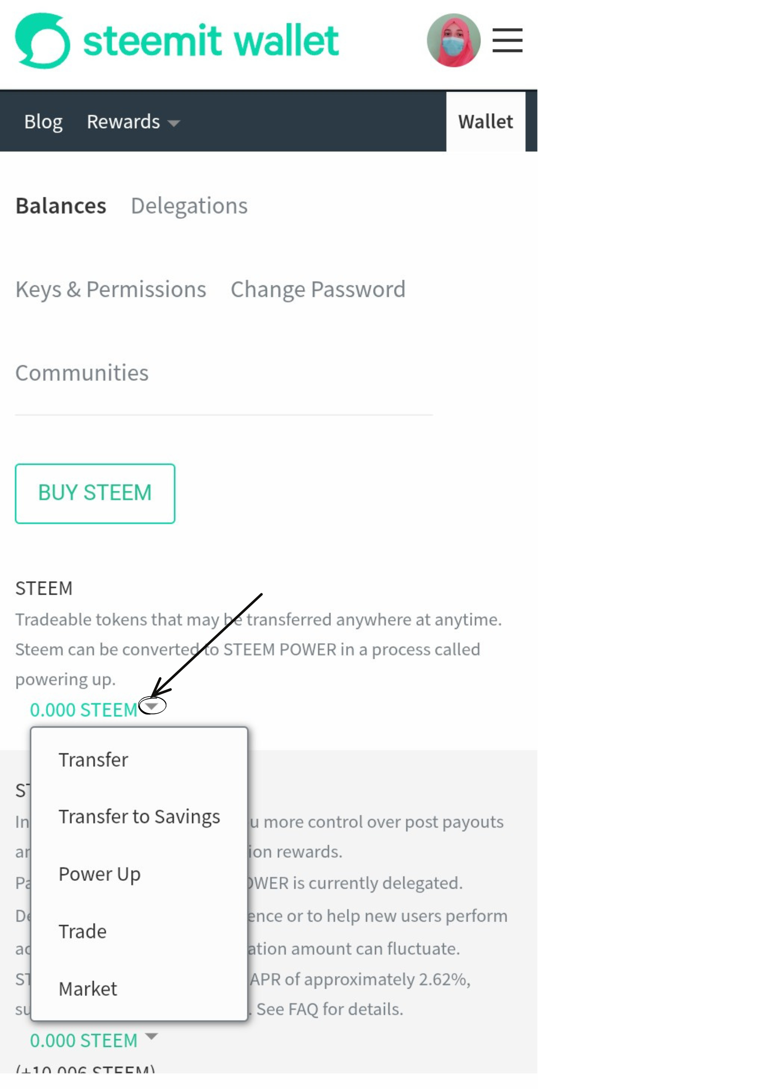 Answer : Yes, I know how to power up my steem. I will open my wallet . Then click on drop-down arrow beside the steem balance, a menu will appear as shown in my screenshot below.
