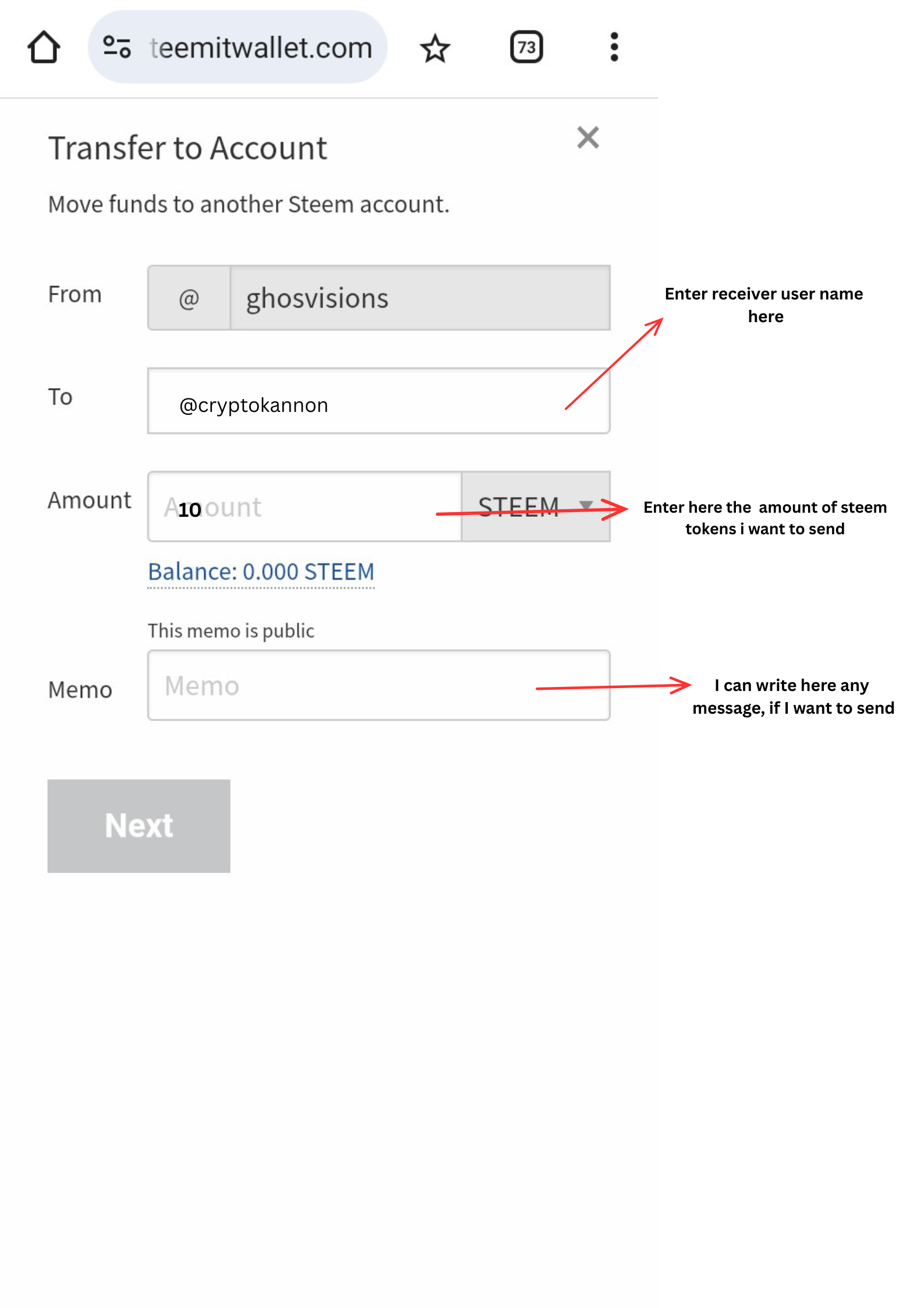 Then, I will enter the receiver account name to whom I want to transfer steem tokens. Just like as an example in my screenshot below, I entered cryptokannon name. Next, I will enter the number of amount I want to send and in memo box , I will write any message if I want to send her. Click Next and confirm transfer.