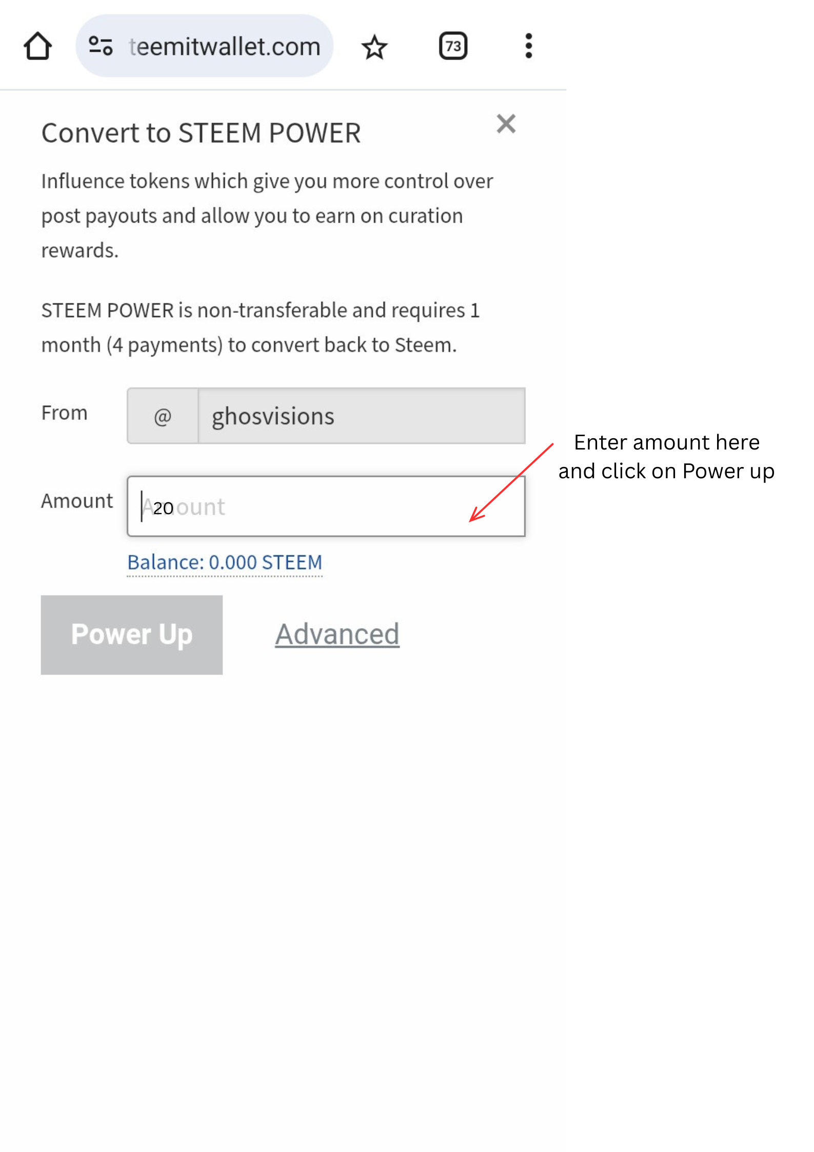 At the end, I will enter the amount of steem I want to power up and then click on Power Up. That's the process by which I can power up my steem.