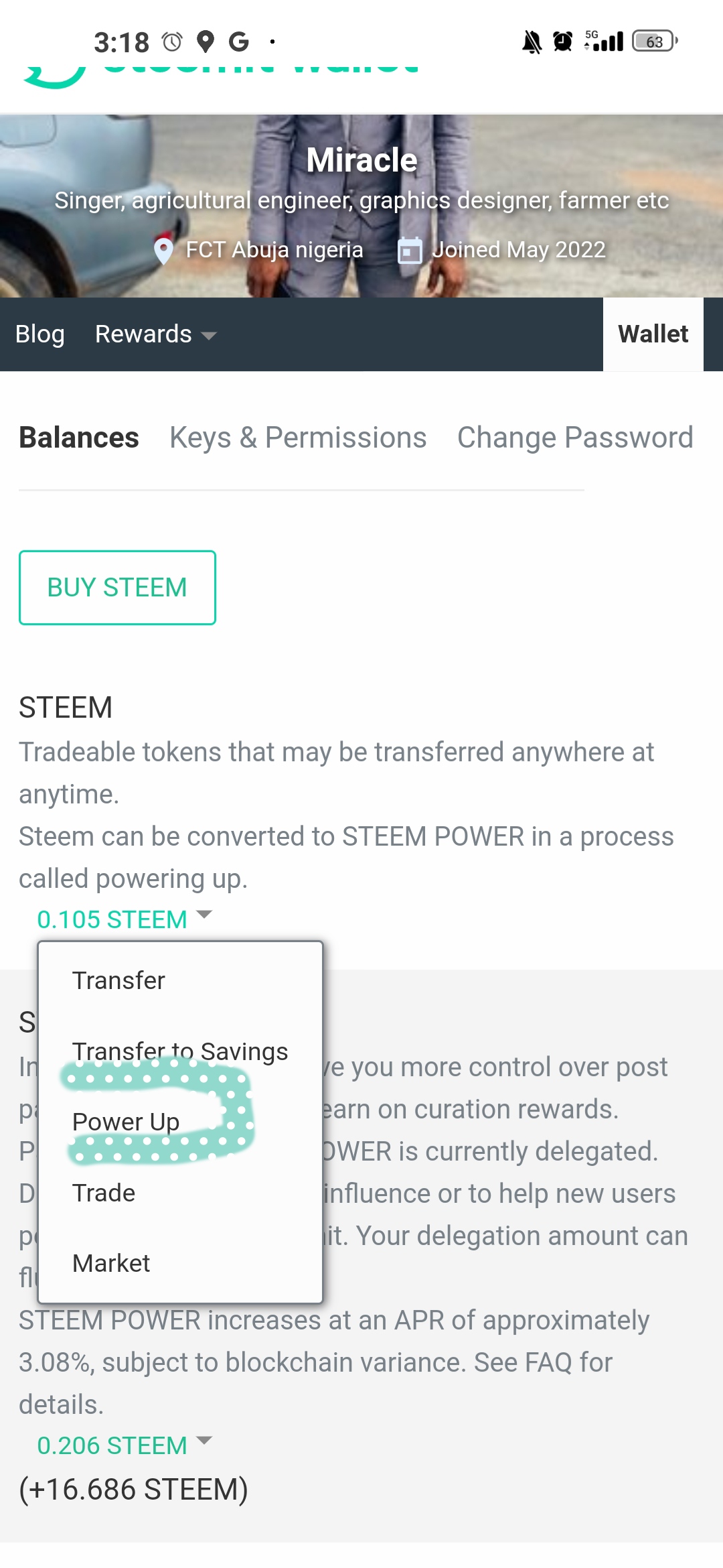 STEP 1: To power up your STEEM open your steemit wallet you will see a title called STEEM, At the bottom right beside the amount of STEEM you have you will see an arrow in form of a Tiny Triangle facing downwards click on it then click Power Up.