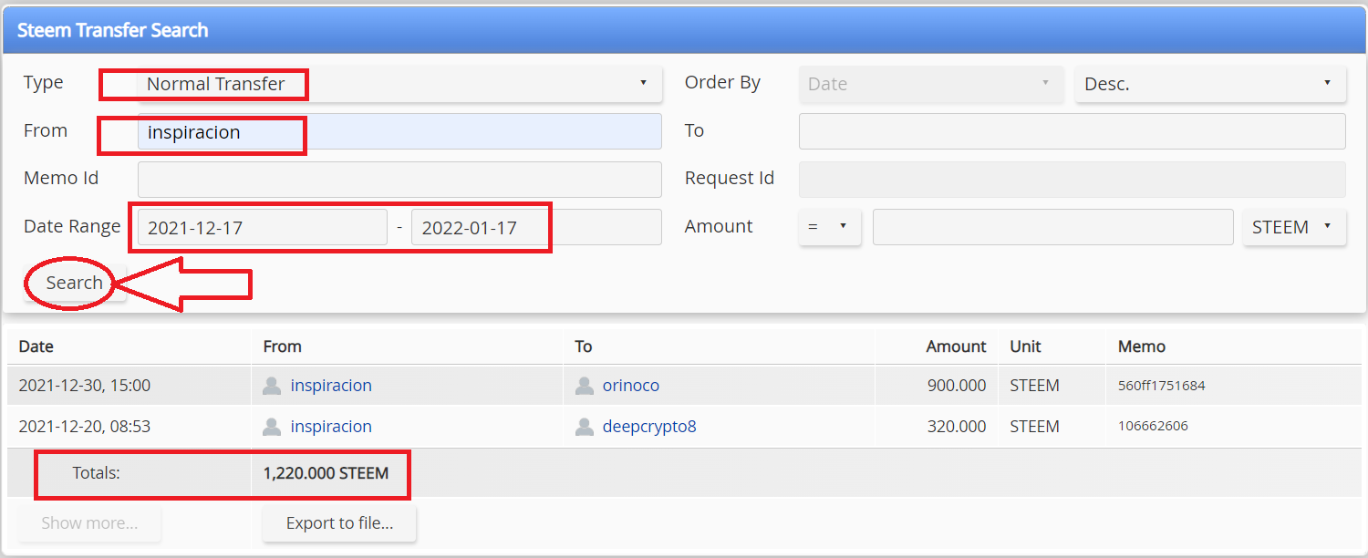 We first check Normal Transfer which refers to withdrawals. We put our user and the date range that covers the last 30 days, and we click on Search:
