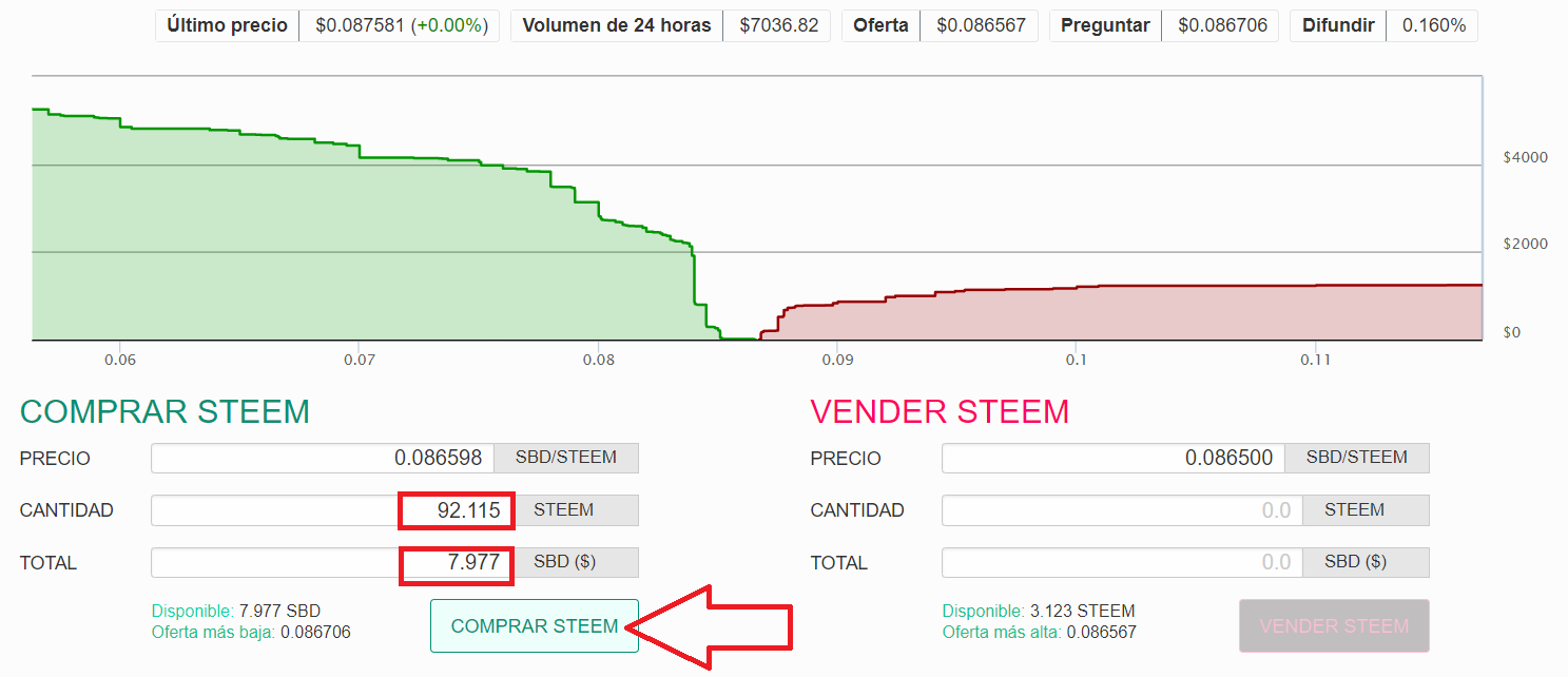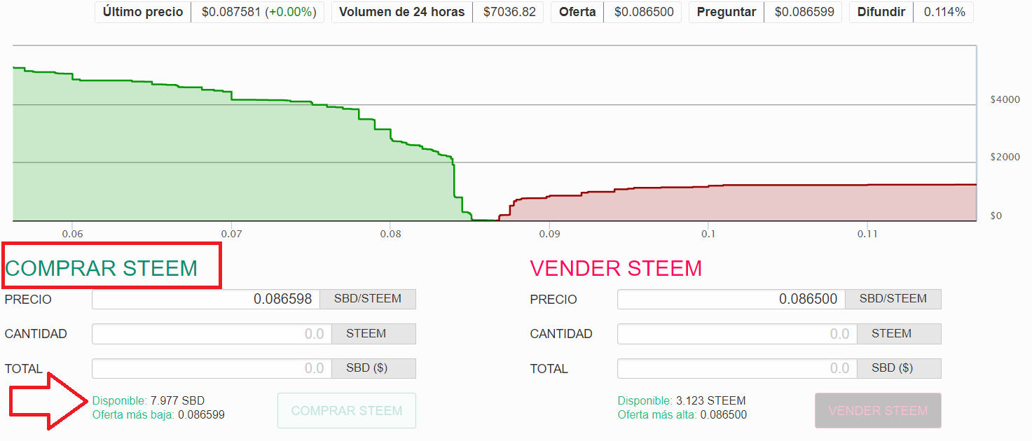 Vamos a Comprar STEEM. Allí en mercado, puedes ver tus SBD disponibles, debes hacer clic allí donde señala la flecha para seccionar tus SBD: