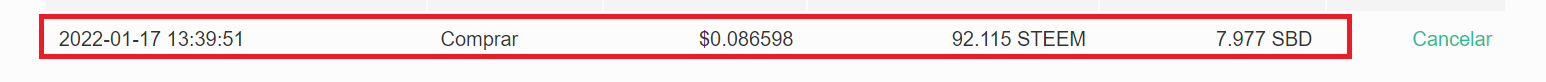 El sistema te mostrará el precio del STEEM en el mercado interno, y cuantos STEEM recibirás por tus SBD, en este caso recibiré 92.115 STEEM por 7.977 SBD, y hago clic en Comprar: