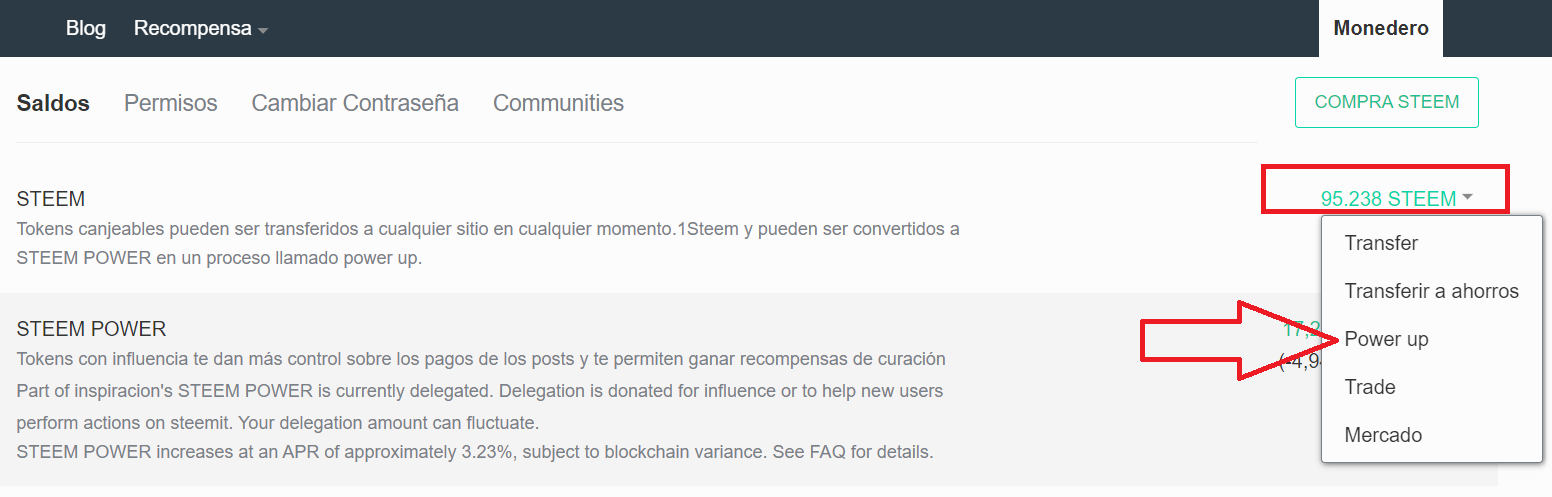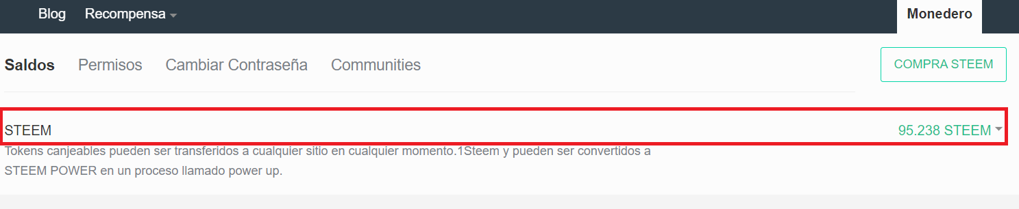 Una vez que se haga efectiva, ya podemos ver nuestros STEEM en la Wallet. Como yo tenía un pequeño saldo previo ahora tengo 95.238 STEEM.