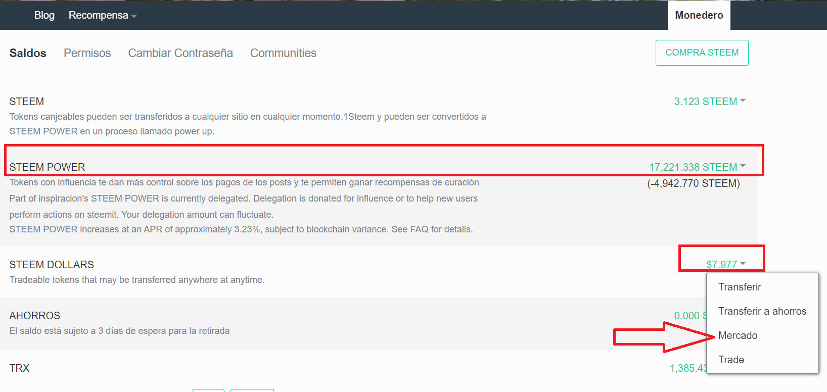 En el ejemplo puedes ver que allí se puede ver los 7.977 SBD que reclame. Y que tengo previamente un Steem Power de 17,221.338. Ahora hay que seleccionar la opción Mercado