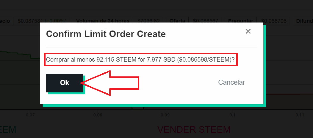 The system will show you the price of STEEM in the internal market, and how many STEEM you will receive for your SBD, in this case I will receive 92,115 STEEM for 7,977 SBD, and I click "Buy":