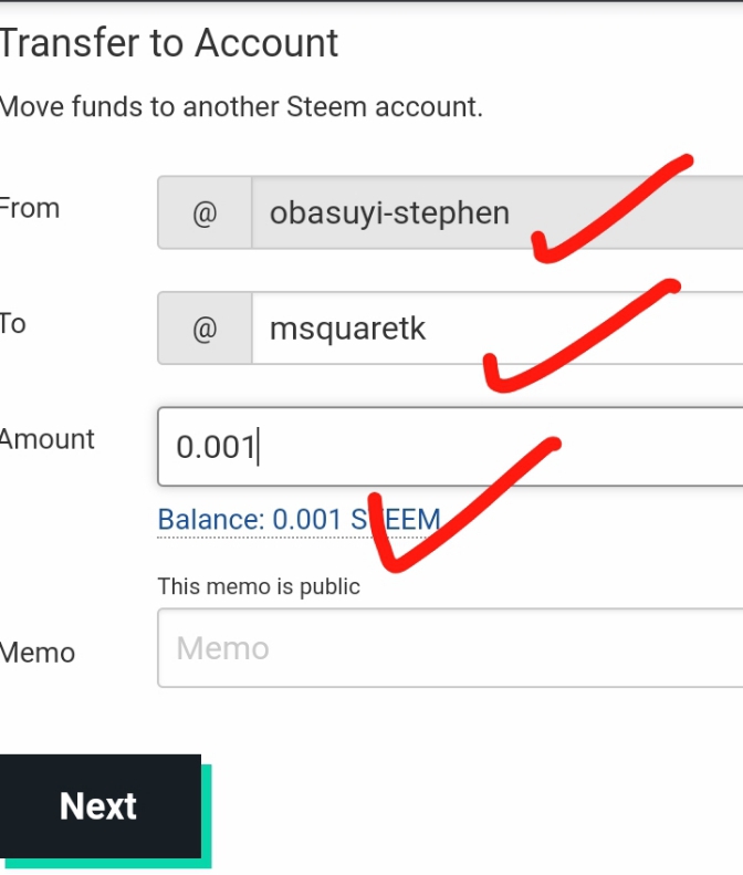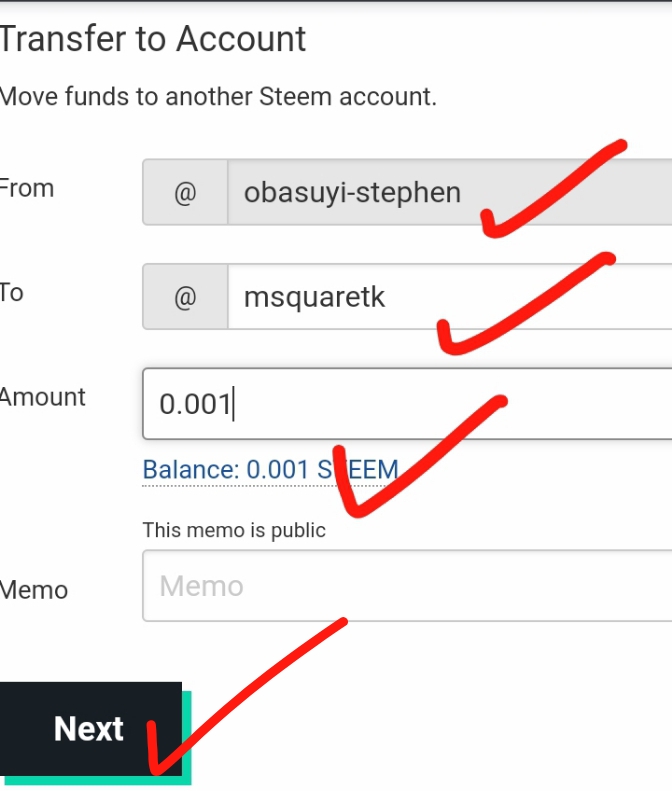 • Step 2 : After clicking transfer, then comes the next stage where three boxes are meant to be filled, the first box is meant for the user name of the account the token is being transferred to, the second box is meant for the amount of token you intend to transfer and the last box is meant for your memo key. Below is a diagram of the explanation.