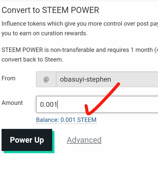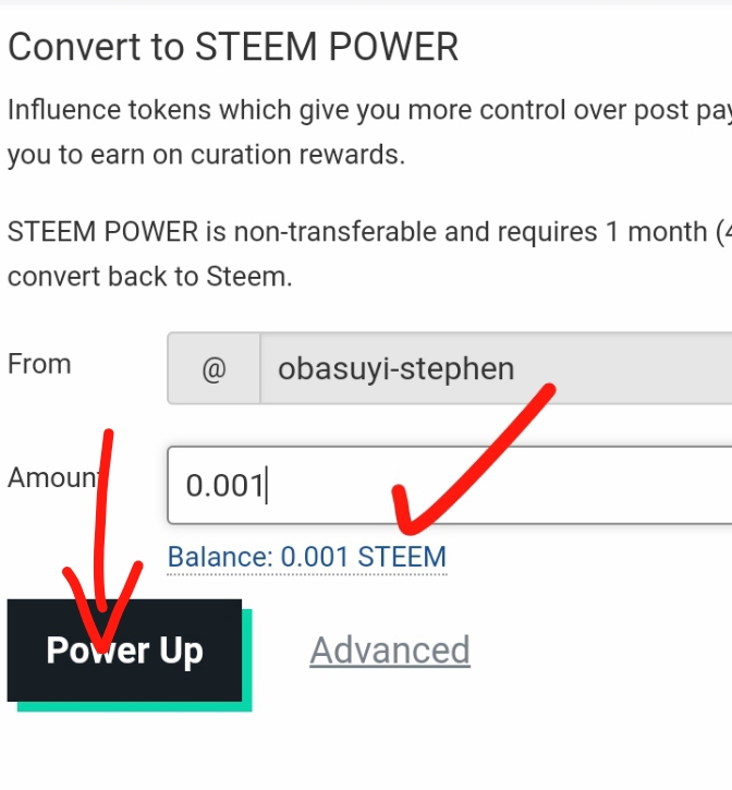 • Step 2: After clicking power up, it proceeds to the next phase where you enter the amount of steem you intend to power up, note that steem is automatically converted to steem power at this phase . See picture below.