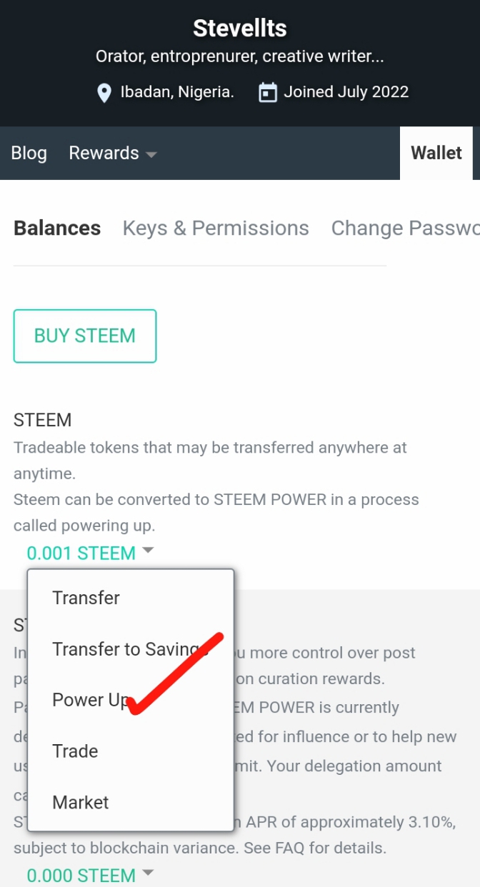 • Step 1: I will log into my wallet and click on STEEM, then from the options provided I will click on power up. This can be seen in the image below.