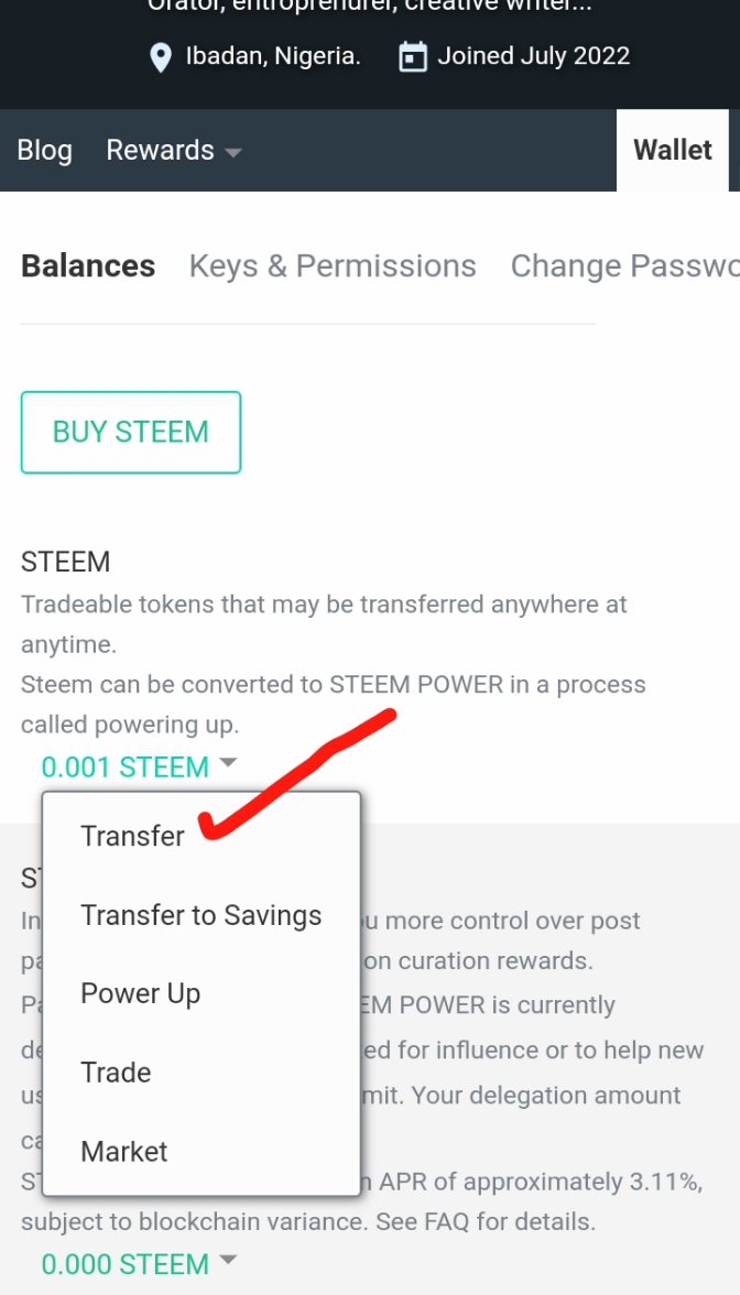 wallet, click on STEEM,and select transfer from the options. Below is a picture explanation.