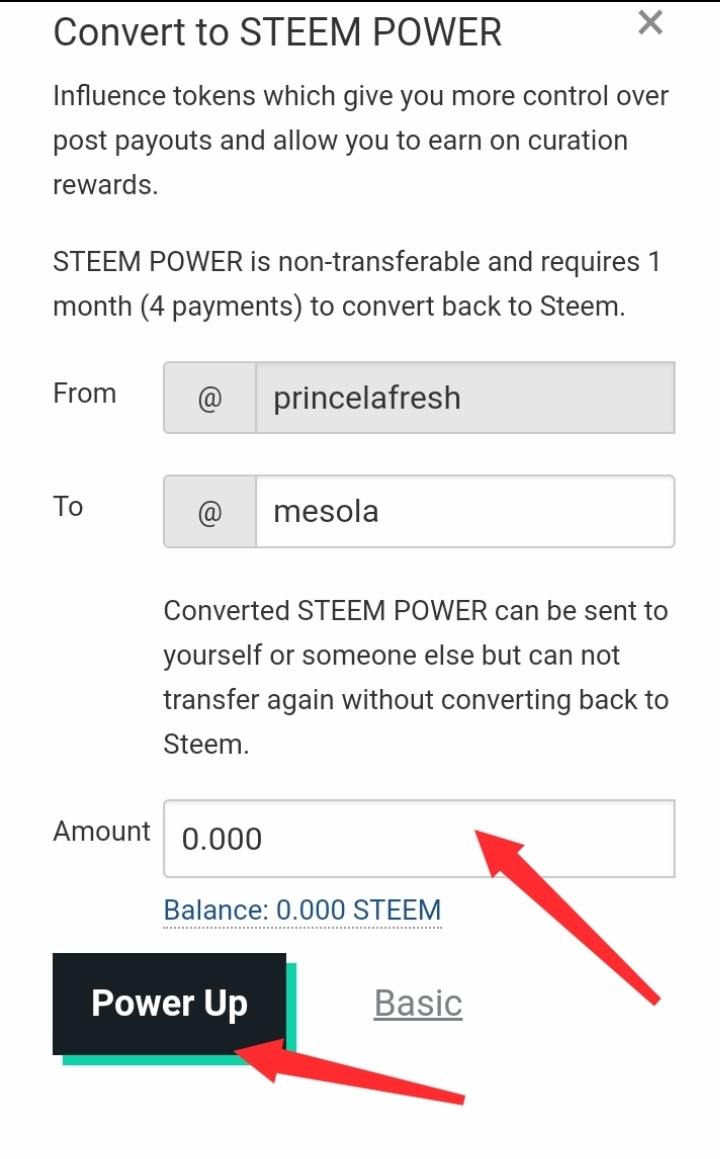 I will first of all login to my wallet with my posting key. After that I will now click on the drop down beside step then I click on power up then I put the number of my steems that I want to power up.