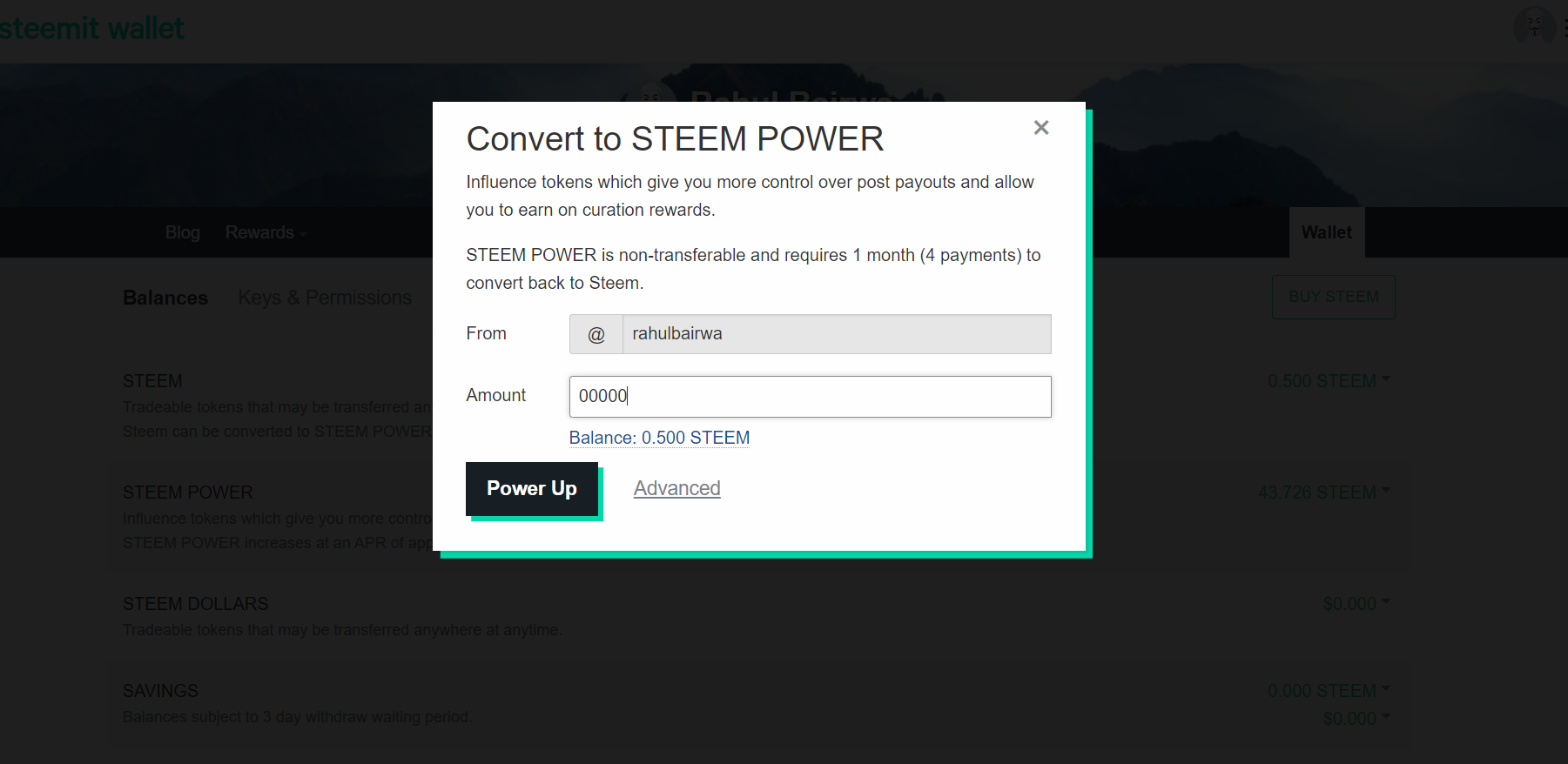 2.Then you will see a new pop up window with the title of "Convert to STEEM POWER", enter the amount you want to transfer to increase your steem power(SP), and then click powerup.