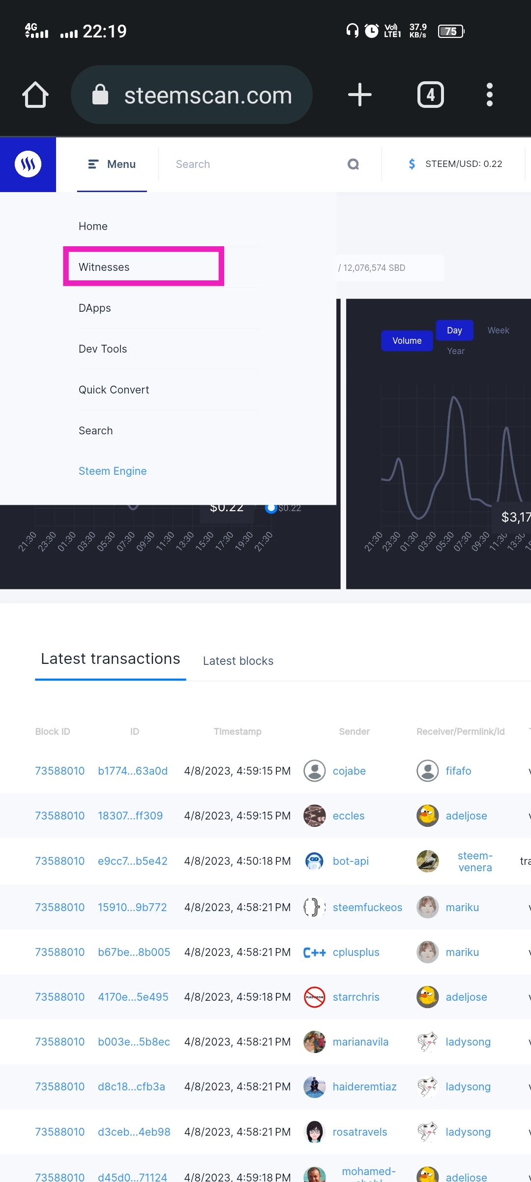 First, guys, let's visit the Steemscan.com website and click on the witness on the menu tab.