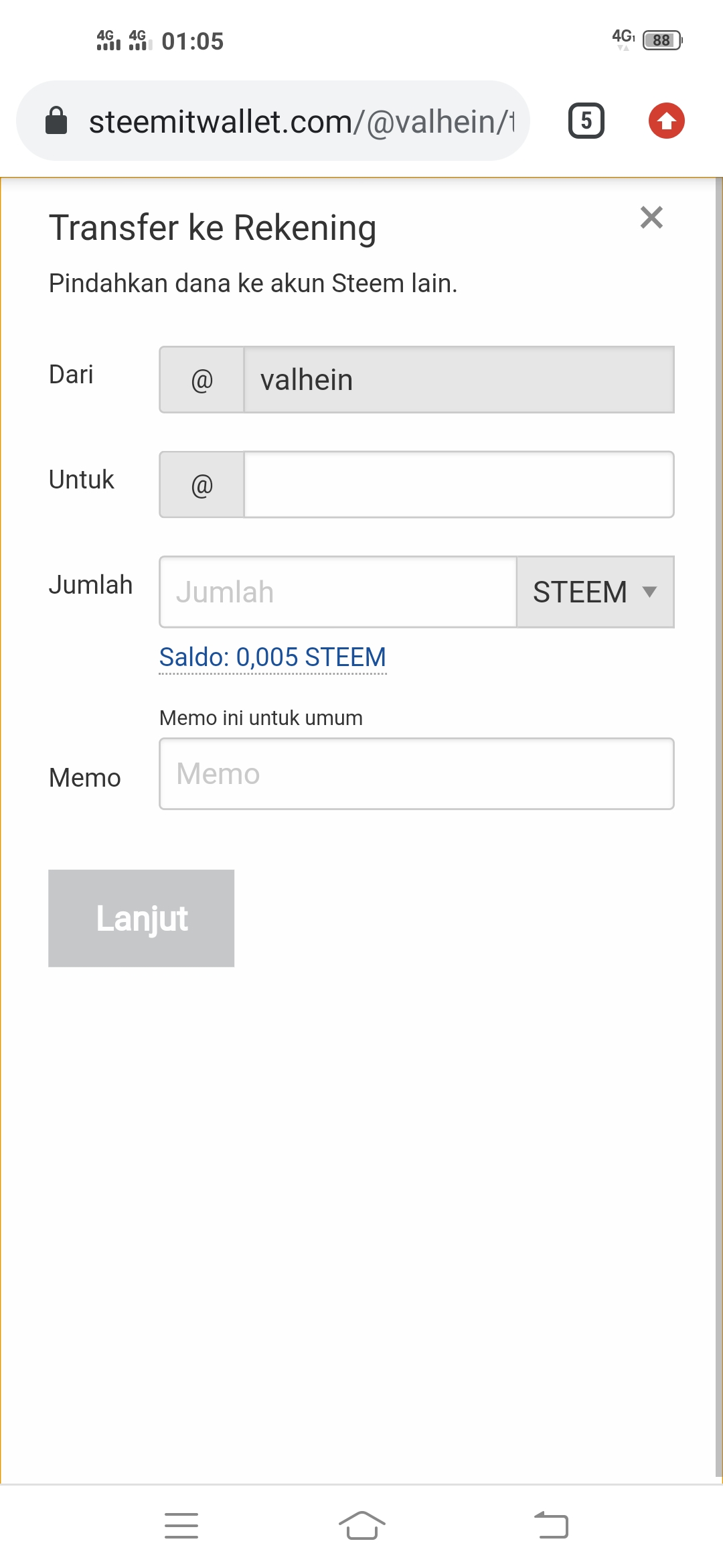 Pertama masuk dulu ke wallet satelah itu kamu akan dibawakan ke transfer rekening dan selanjutnya masukan nama penerima dan jumlah dominan steem yang ingin kamu transfer setelah itu tekan tombol lanjut.