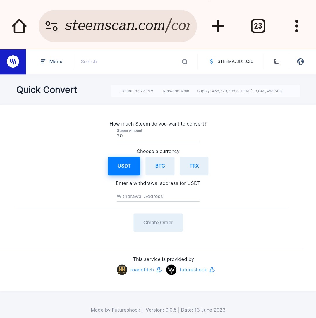 Quick Convert: Helps to convert Steems to other cryptocurrencies like the available 3, which are USDT, BTC, and TRX, you input the steem amount you intend to convert, choose the currency, then enter the withdrawal address and create an order to proceed.