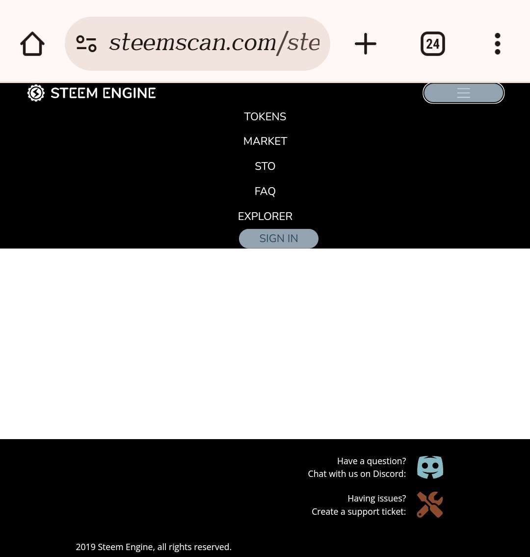 Steem Engine: while on the search engine, you will find a navigation tool by the top right click to reveal Tokens, market, Sto, faq, explorer and sign in, where you input your steem username, private posting key, and sign in to access your account.