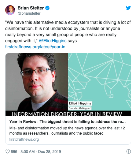 "We have this alternative media ecosystem that is driving a lot of disinformation. It is not understood by journalists or anyone really beyond a very small group of people who are really engaged with it," reads the ironic Higgins quote in the excerpt shared by Stelter.